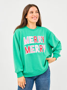 Double the cheer in the Sarah Sweatshirt. This vibrant green pullover features bold “Merry Merry” lettering in festive red and white chenille for a playful holiday statement. With its relaxed fit, ribbed trim, and cozy fabric, it’s the perfect sweatshirt for everything from tree trimming to holiday movie marathons. Pair it with jeans or leggings for an effortlessly merry look all season long.