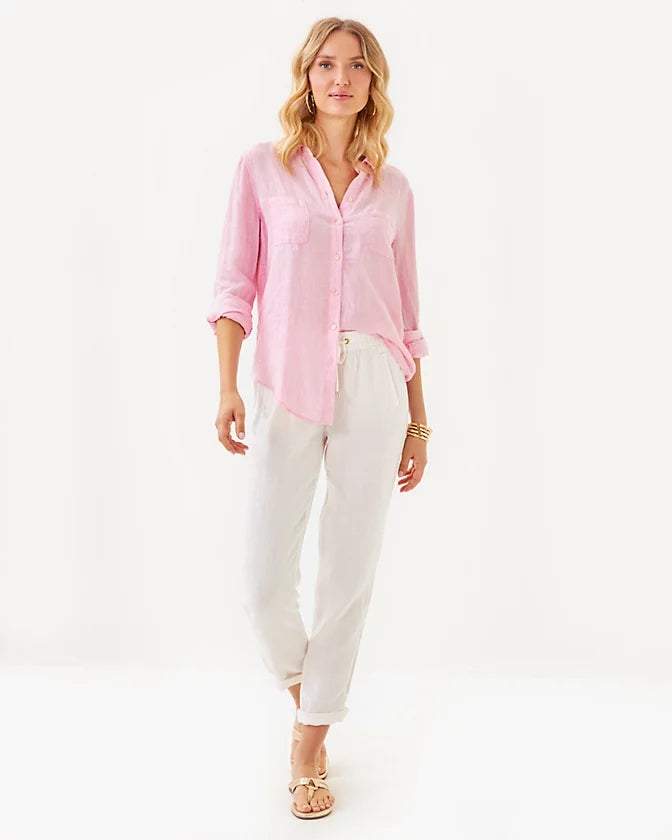 Sea View Linen Button Down Top - Conch Shell Pink X Resort White