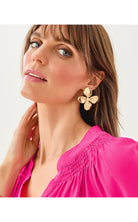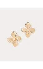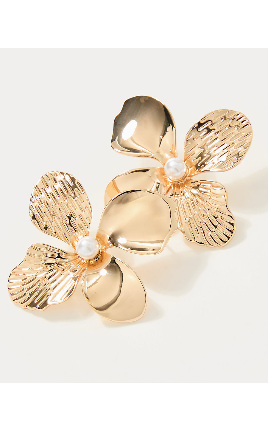 - Gold textured orchid earrings with a pearl center.