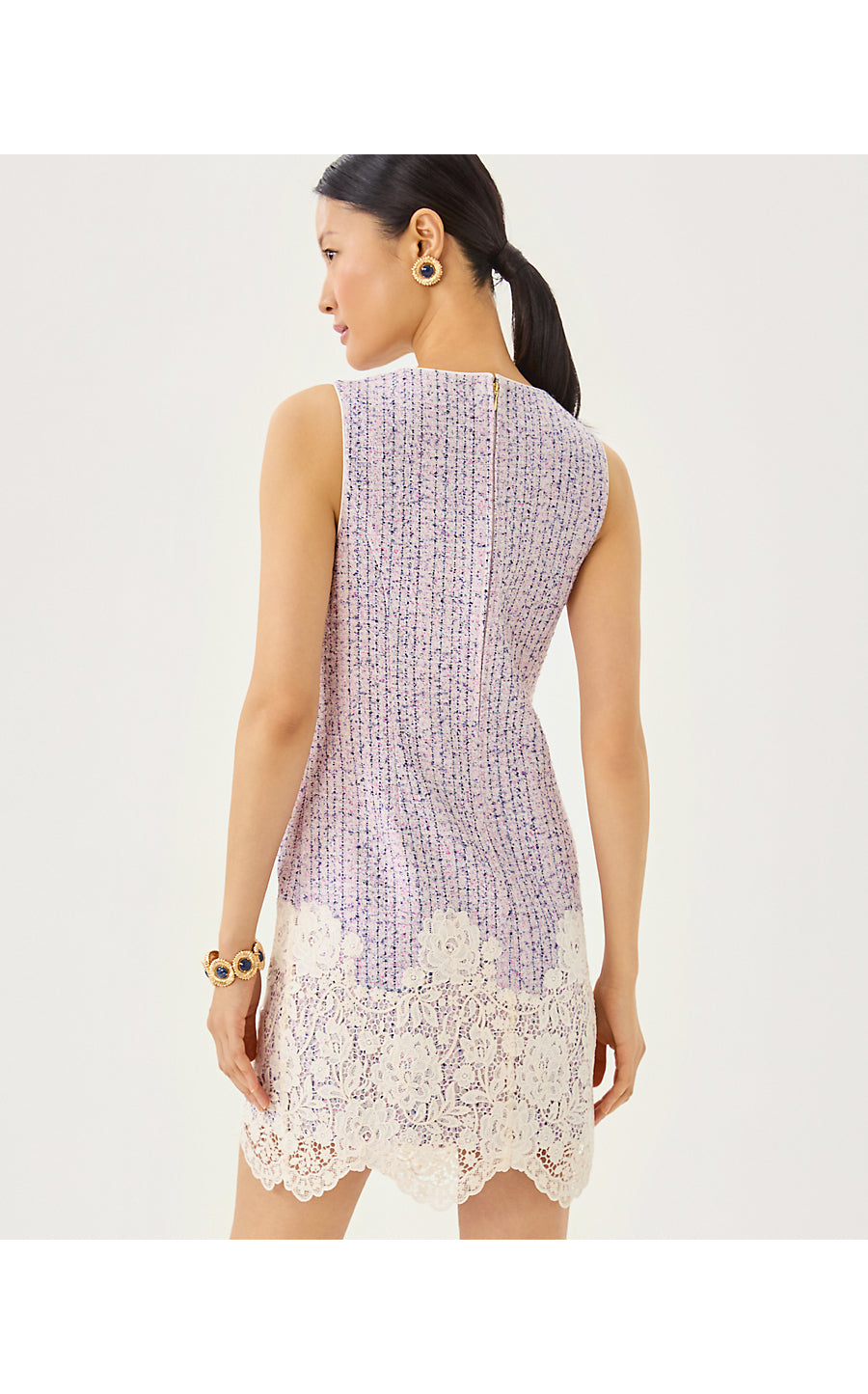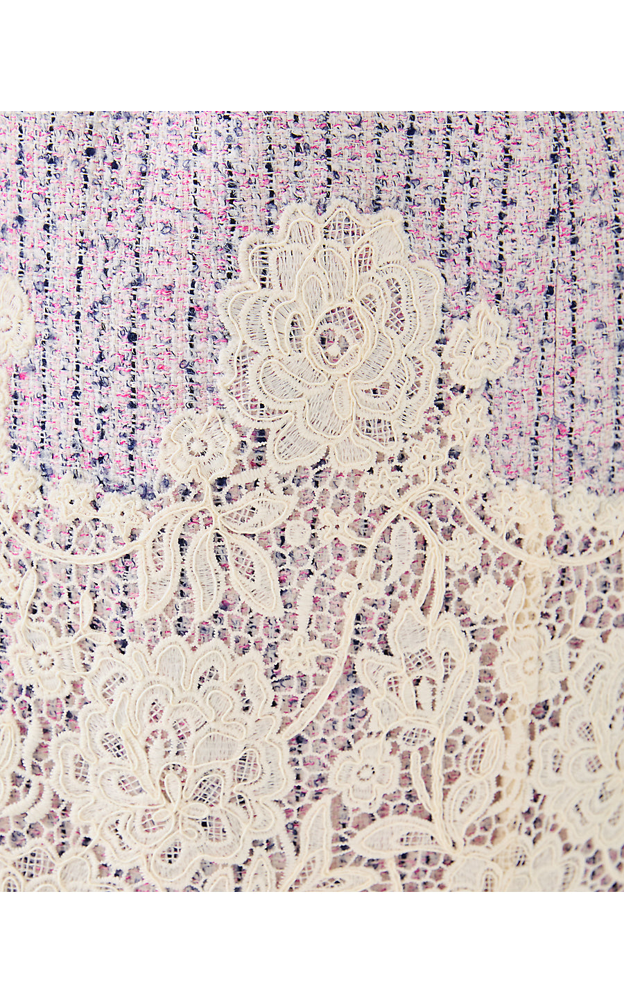 - Fitted, crew neck shift dress with a scalloped, corded lace applique at the hem.
