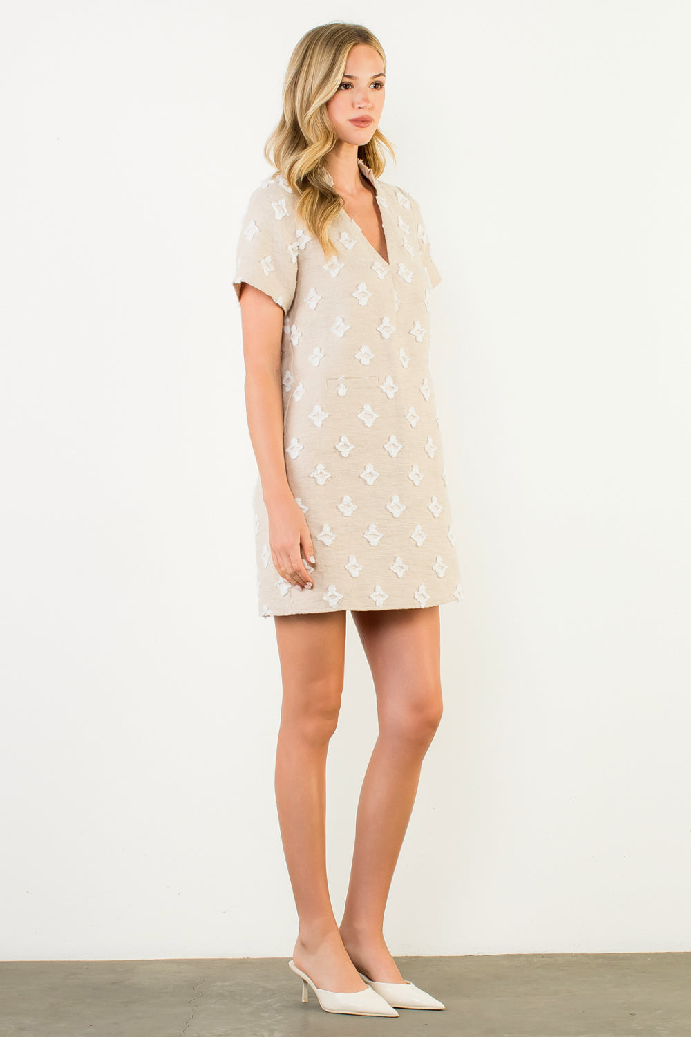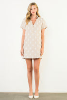 The beige color is endlessly versatile, acting as a neutral base for bold accessories or layering pieces. Its warm undertones flatter a variety of skin tones and pair seamlessly with everything from classic black to earthy tones or pops of color. The short sleeves provide just the right amount of coverage while keeping the look light and airy, and the short hemline adds a fresh, youthful touch.