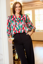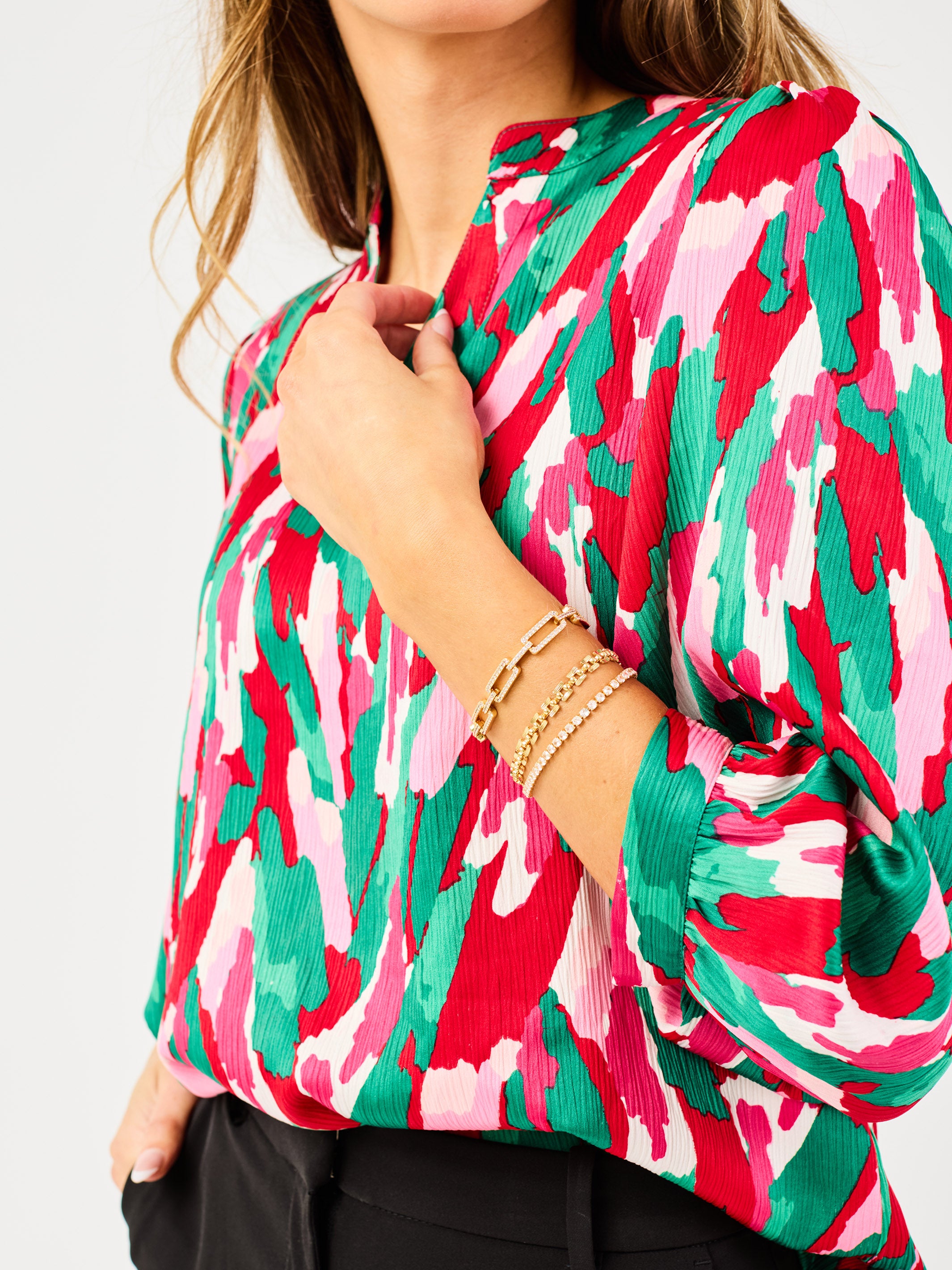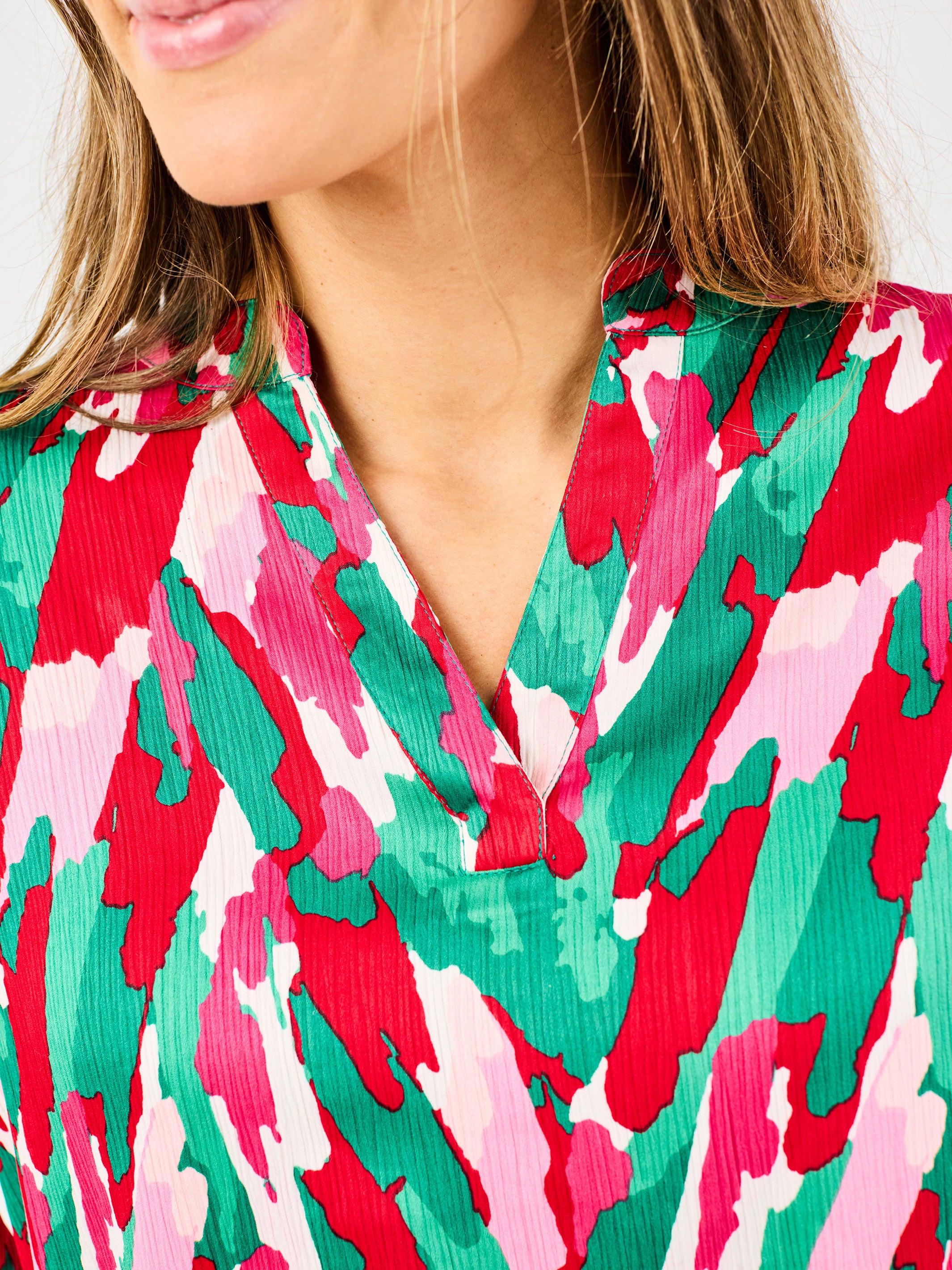 The Tamryn Top brings vibrant style and easy sophistication to your look. Designed in a lively abstract print of pink, red, and green, this blouse features a relaxed silhouette with a split neckline and subtly gathered sleeves for an effortlessly chic fit. Lightweight and flowy, it’s perfect for both polished and casual outfits — pair it with white jeans for daytime or sleek pants for a night out. A statement top that makes getting dressed feel fun and fresh.