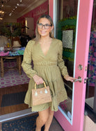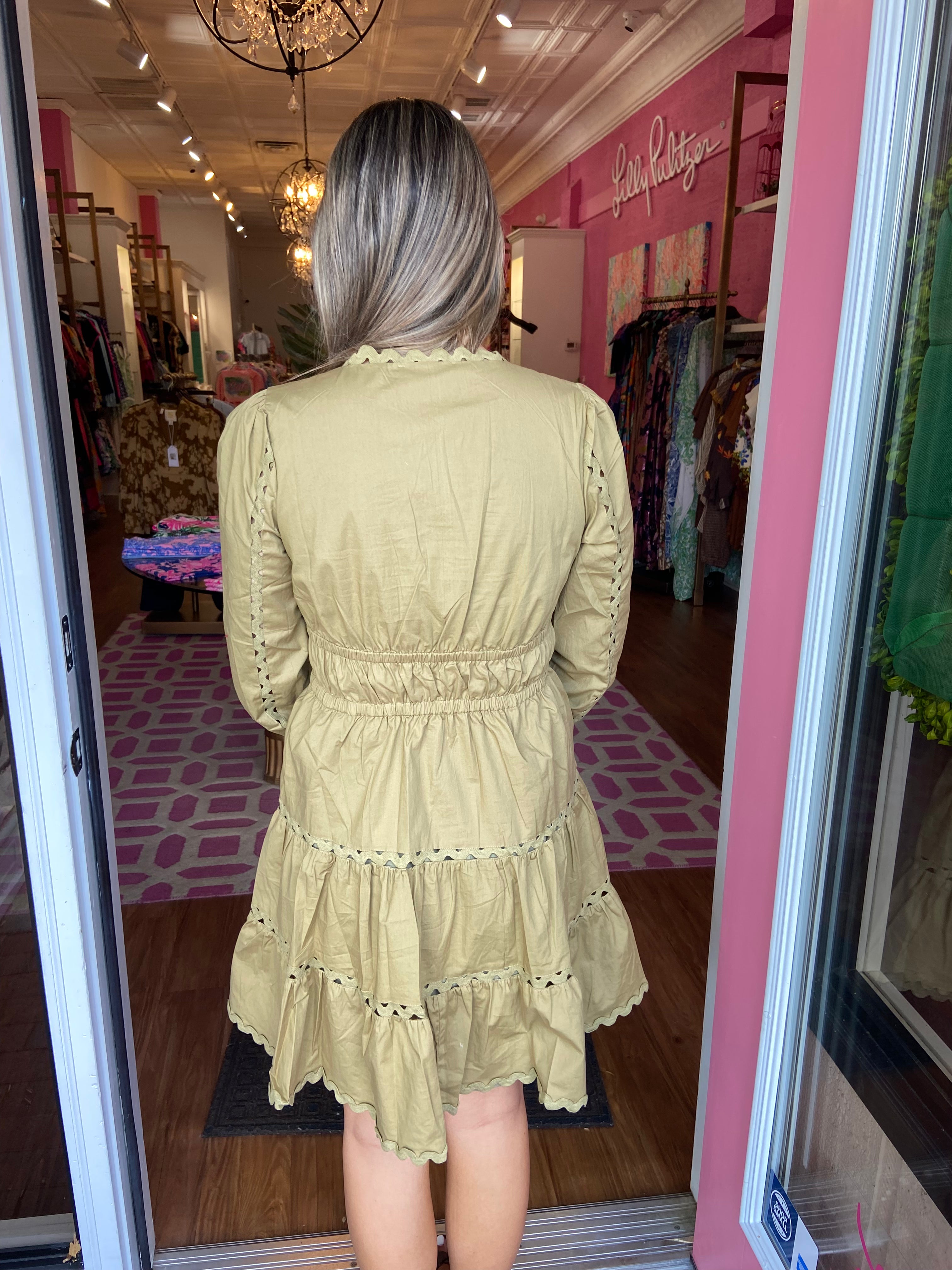 V-Neck Cinched Waist Dress w/ Ric Rac - Moss Green
