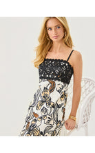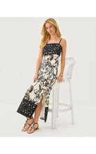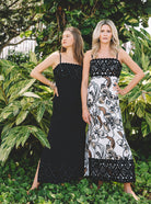 - Fitted, square neck maxi dress with adjustable spaghetti straps, bodice cups, side slits, and wide Lilly lace trim.