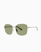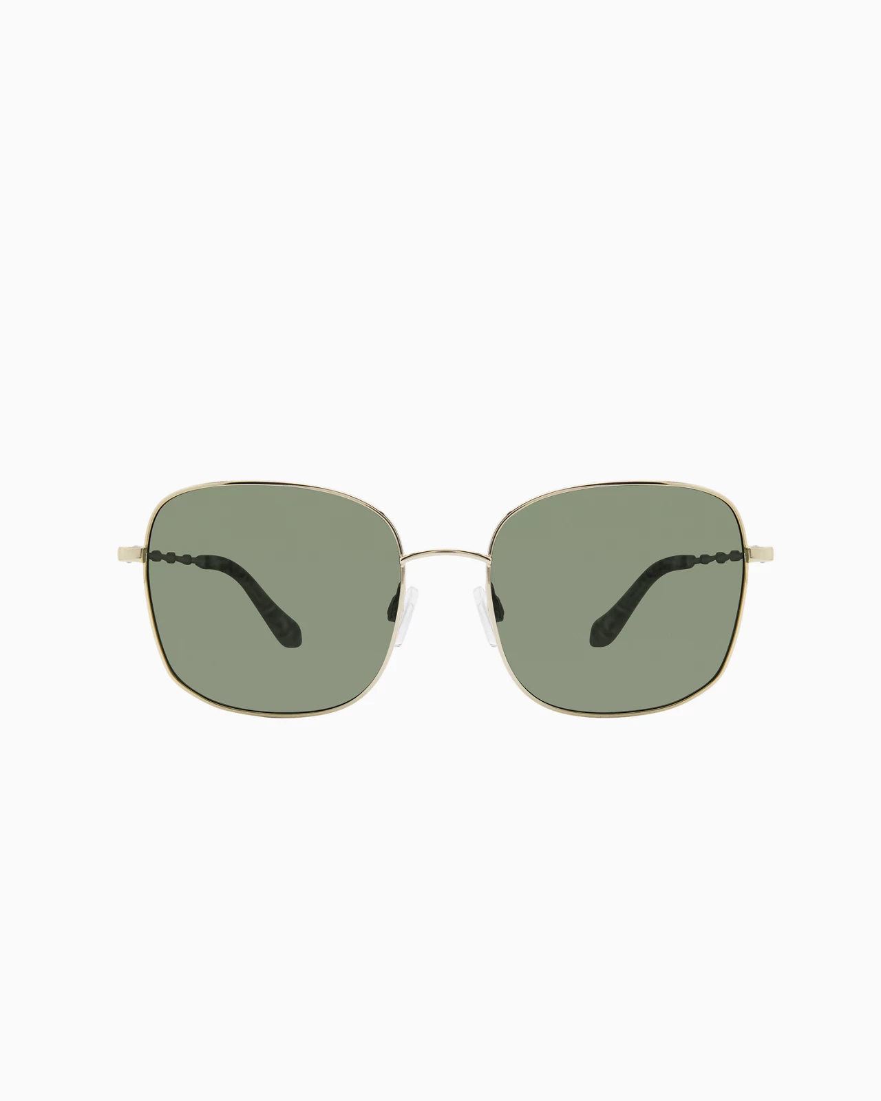 - Metal square shaped sunglasses with a bamboo temple and polarized lenses.