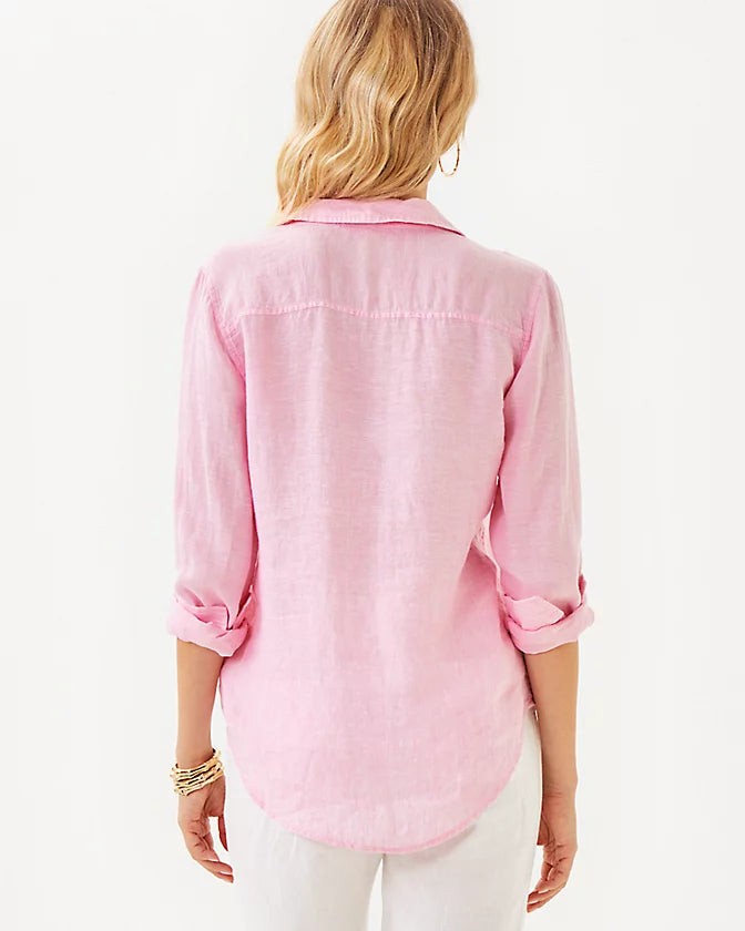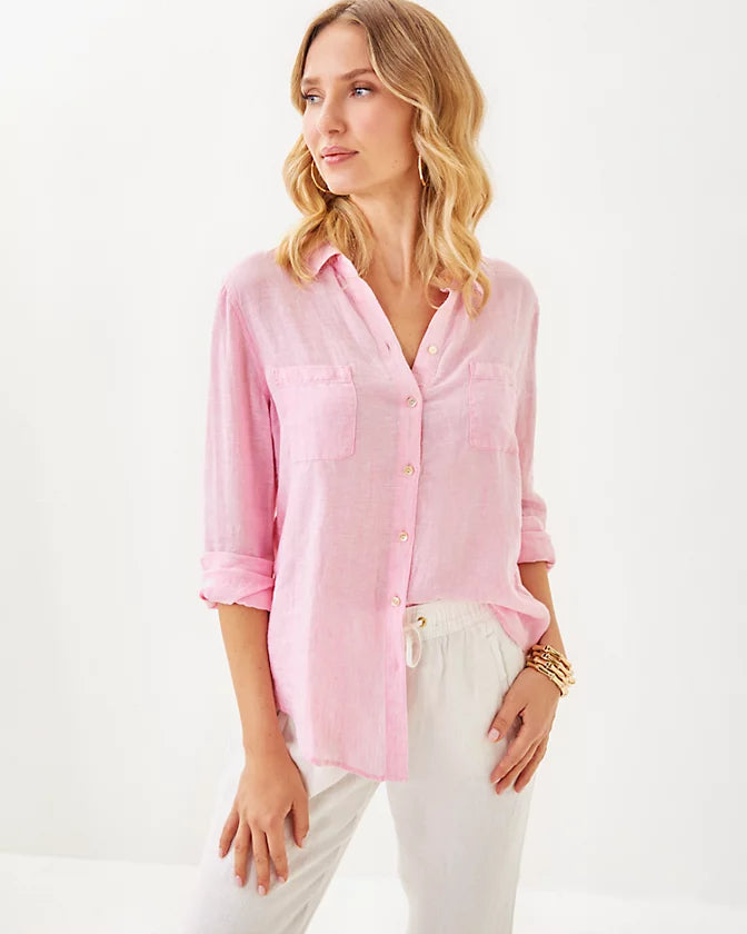 Sea View Linen Button Down Top - Conch Shell Pink X Resort White