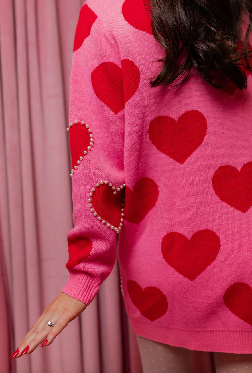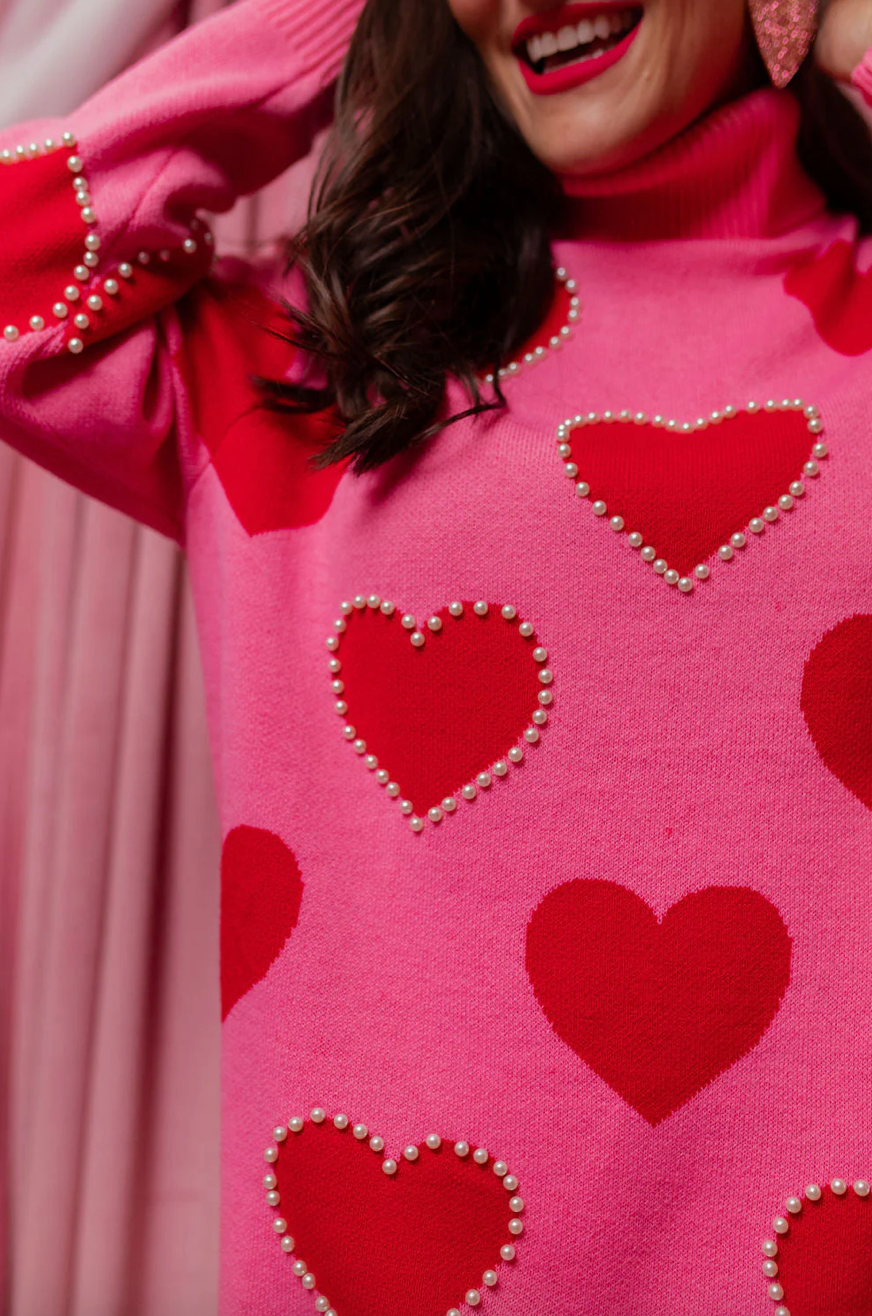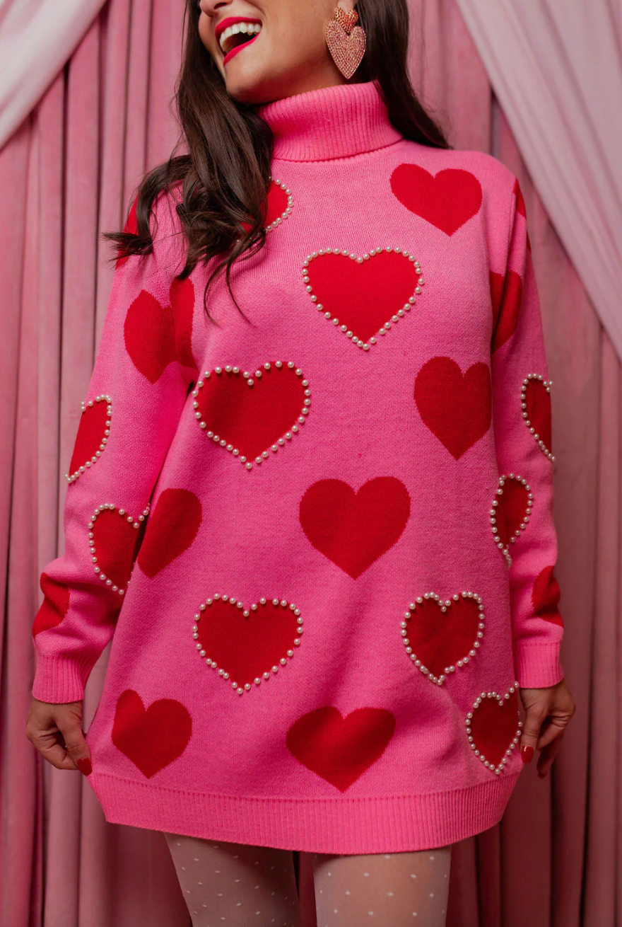 Pink Sweater Tunic with Red Hearts and Pearls