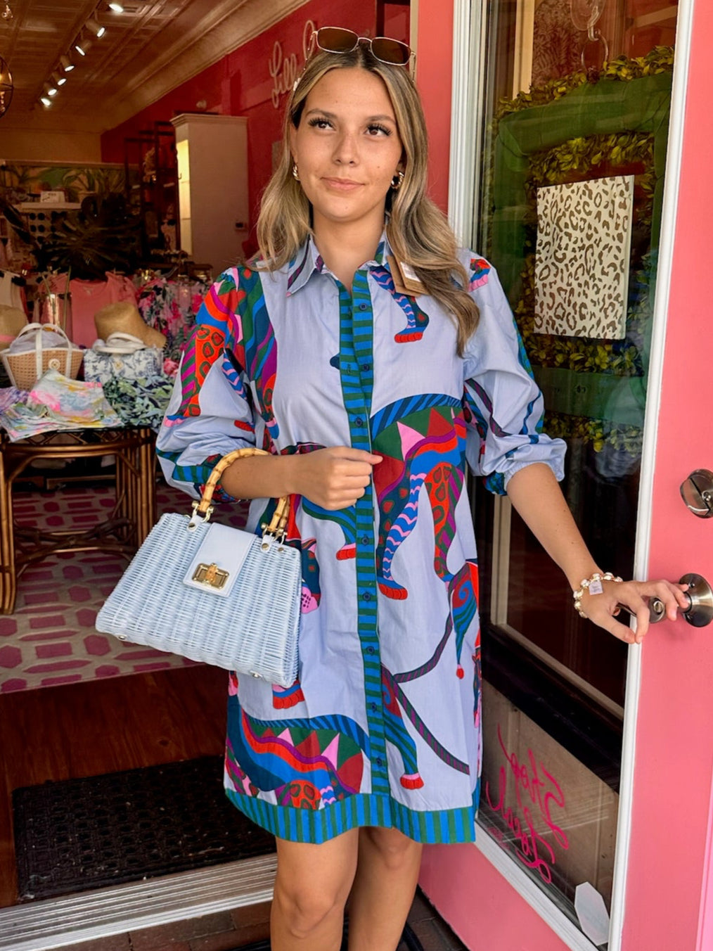 Bring bold energy to your wardrobe with this statement shirt dress, featuring a vivid safari-inspired print in vibrant hues of teal, red, and purple. Designed with a classic collared neckline, front button placket, and contrast striped trim, this dress blends playful style with polished structure. The relaxed silhouette and lightweight fabric make it perfect for warm days, resort wear, or a standout everyday look.