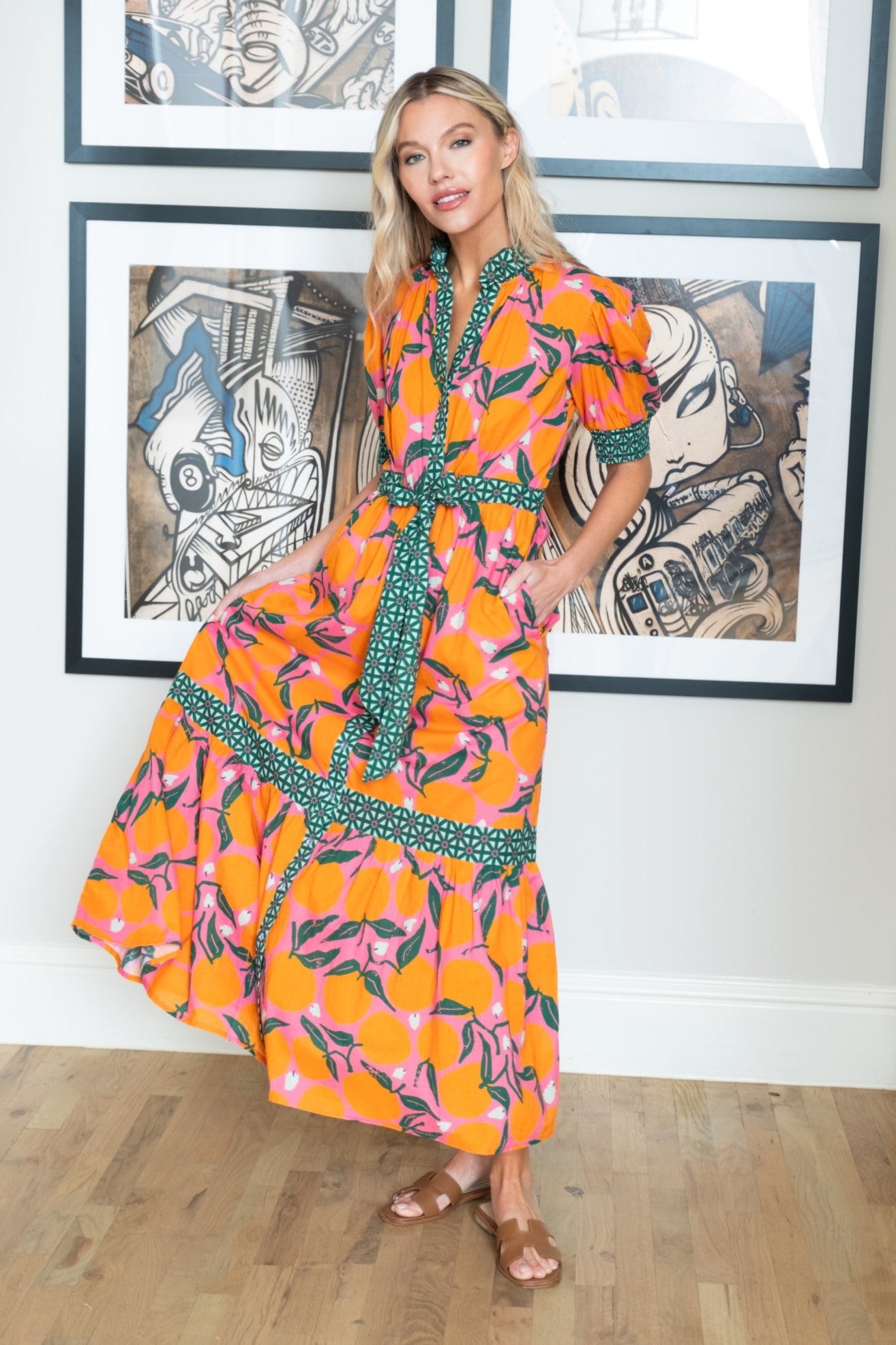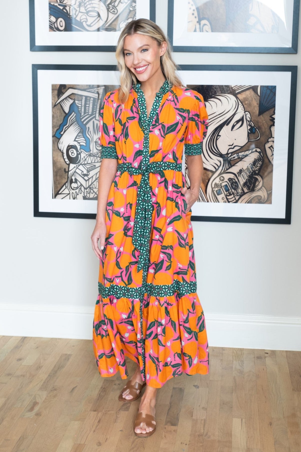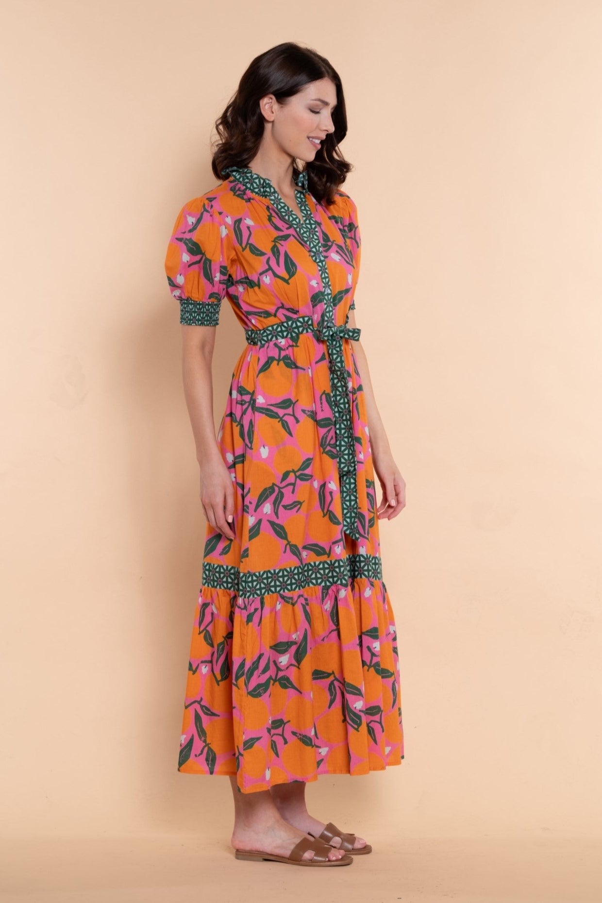 Elevate your wardrobe with the versatile and elegant Birdie Dress in Clementine. Featuring a charming tie waist, puff sleeves, and a vibrant hue, this dress makes a statement with its classic button-down design. Offering a flattering and effortless silhouette, it's perfect for any occasion and transitions seamlessly from summer to fall.