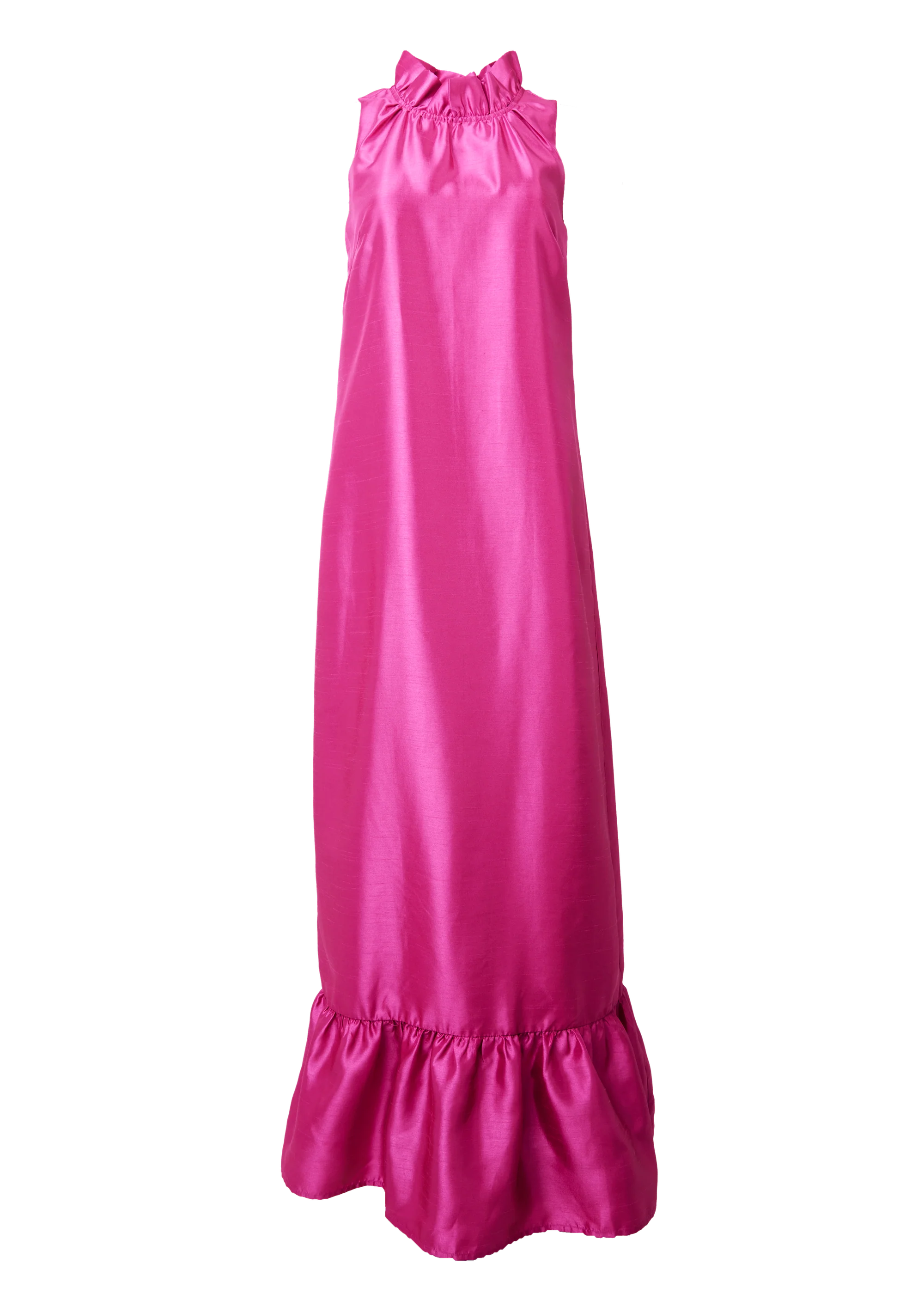 The Camille Gown in hot pink dupioni is a stunning statement for the season. Its elegant column silhouette and softly gathered ruffle neckline combine timeless sophistication with subtle texture and depth. With a luxe fabric that catches the light beautifully, this gown is perfect for weddings and special occasions when you want to feel effortlessly graceful and uniquely polished.