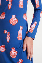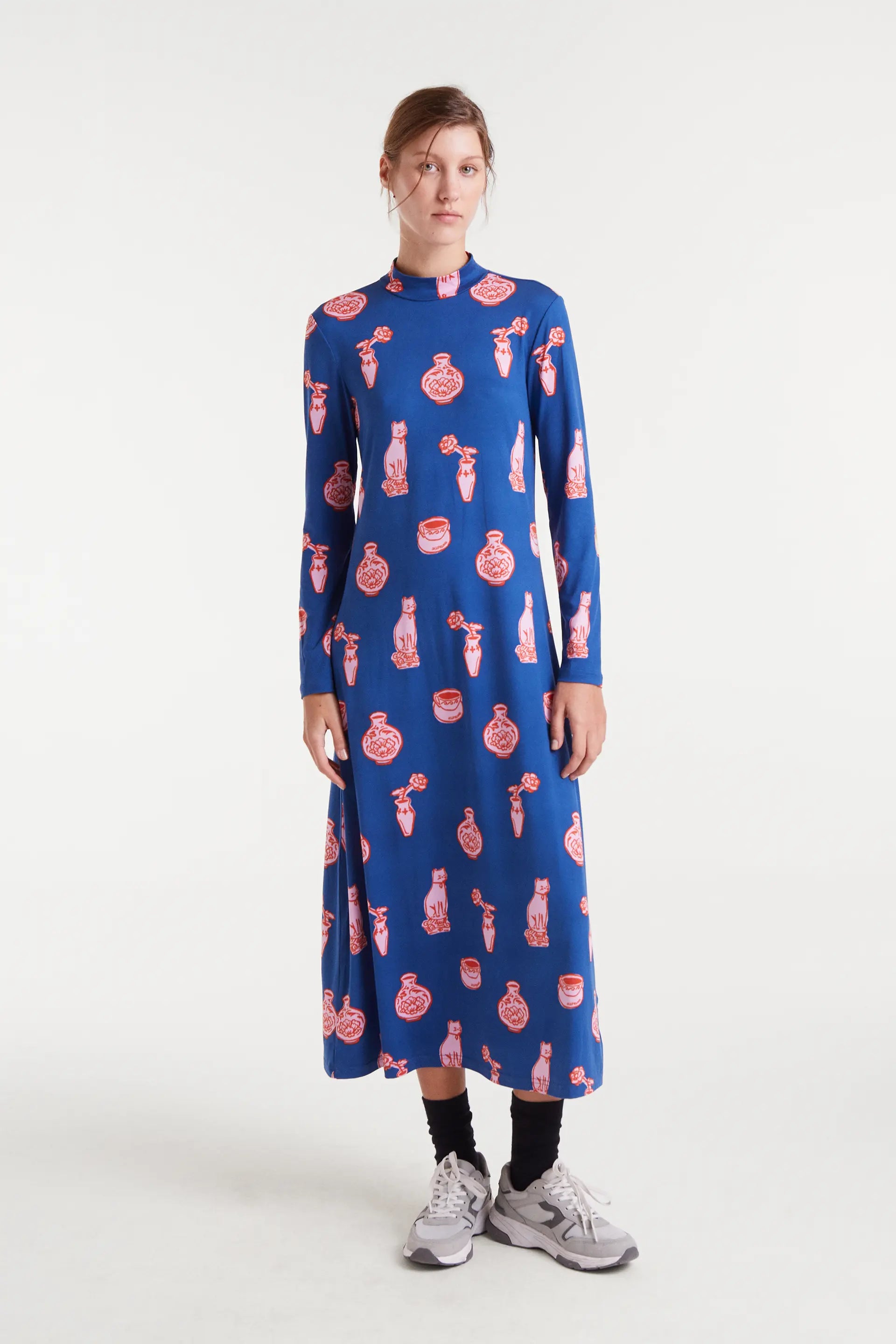 Bring a playful twist to your everyday wardrobe with the Cat & Vase Dress from Compania Fantastica. This statement midi dress features a bold navy backdrop adorned with whimsical pink prints of cats, vases, and florals—making it the perfect balance of quirky charm and chic style. Designed with a sleek high neckline and long sleeves, it offers an effortlessly modern silhouette that skims the body without feeling restrictive.