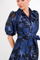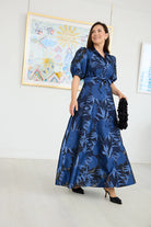 Whether you’re the mother of the bride, a wedding guest, or attending a gala, the Charlotte Gown in Regal Royal Blue and Black Florals perfectly balances playful elegance with modern sophistication. Its timeless silhouette features a black fabric backdrop adorned with striking royal blue floral accents. Style it with sparkling earrings and metallic heels for a polished, unforgettable formal look.