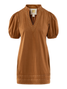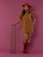 The Hampton Mini in Brown Sugar Suede is a standout take on one of our most beloved silhouettes. Designed with a mandarin collar, V-neckline, and puff sleeves, this dress balances structure with ease. Crafted in plush brown sugar suede, the fabric’s rich texture makes it an ideal choice for the season. Gold studded details trace the neckline and continue across the hemline, giving this classic style a refreshed, modern edge. The mini length adds versatility, making it perfect to wear on its own or layered with boots and outerwear as the weather shifts.