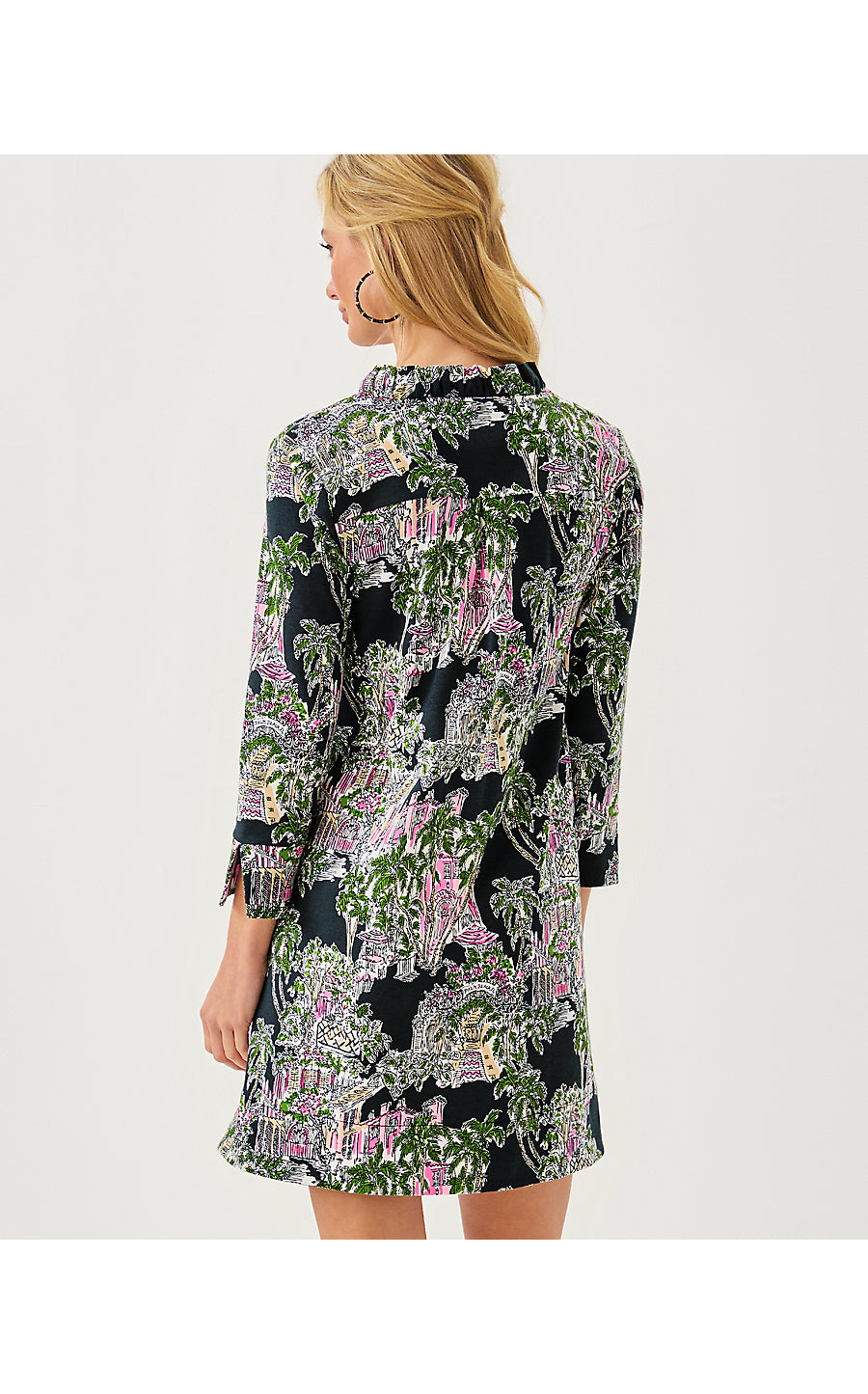 - Easy fit, popover dress with a ruffle collar, gold buttons, and 3/4 length sleeves with slits at the cuffs.