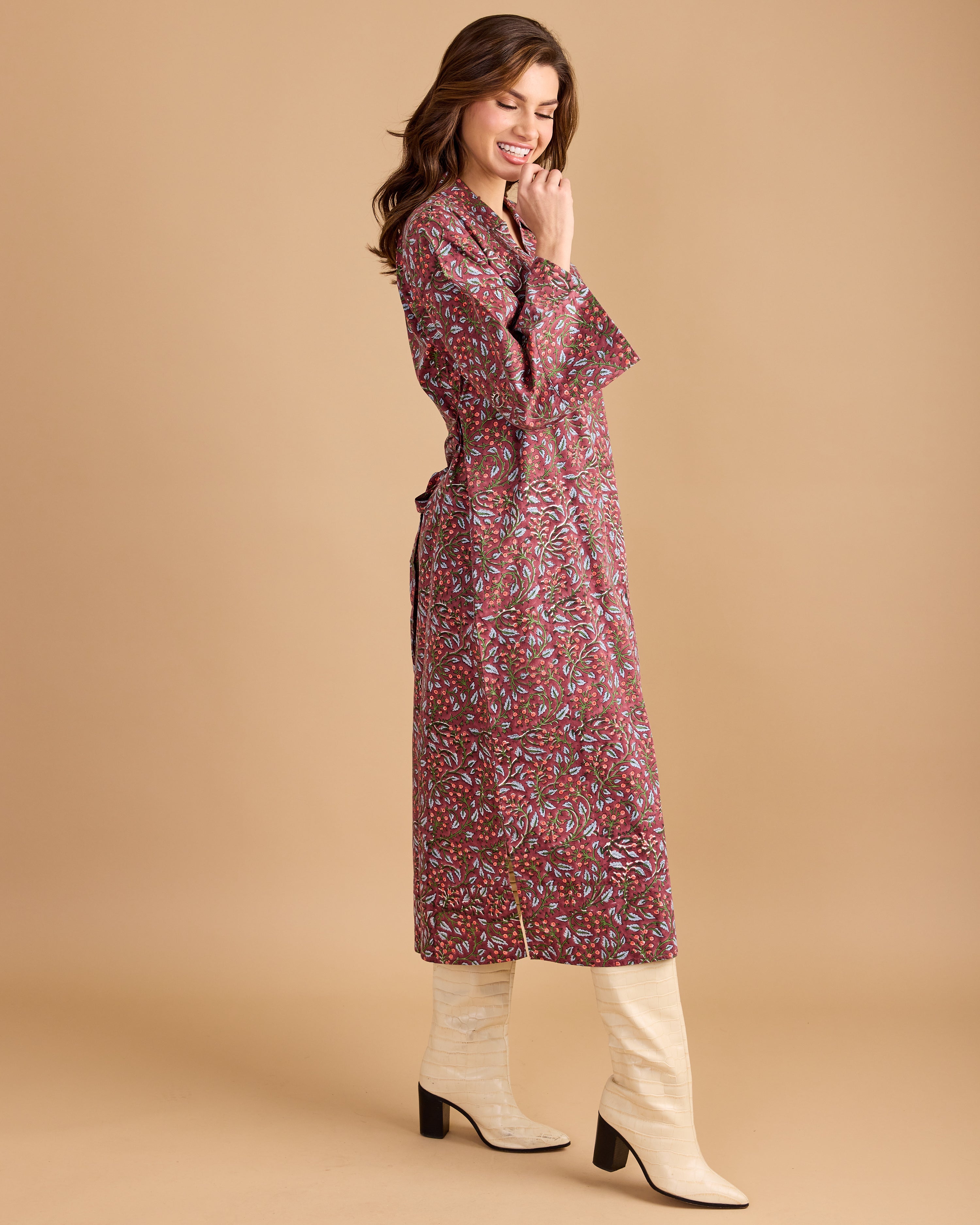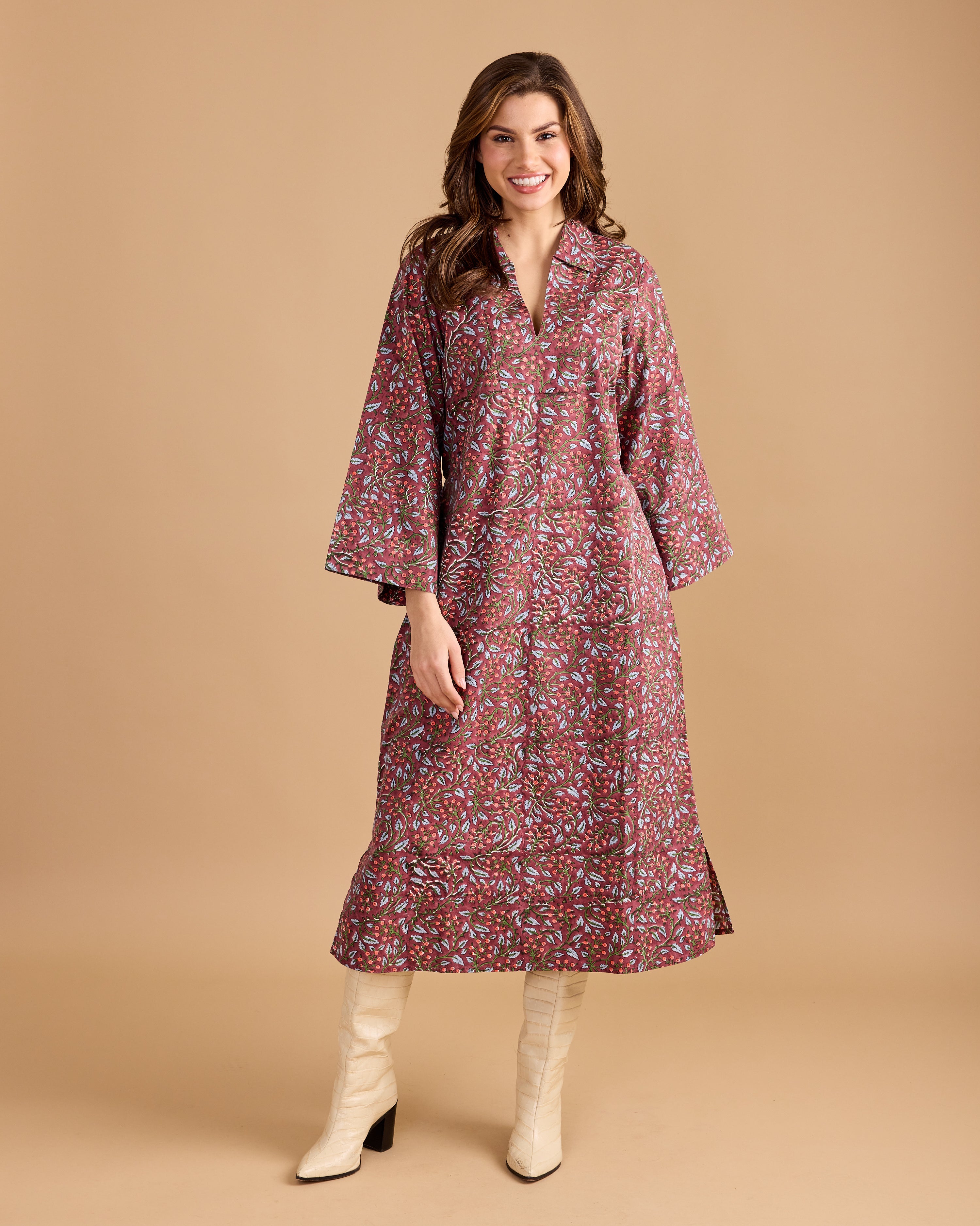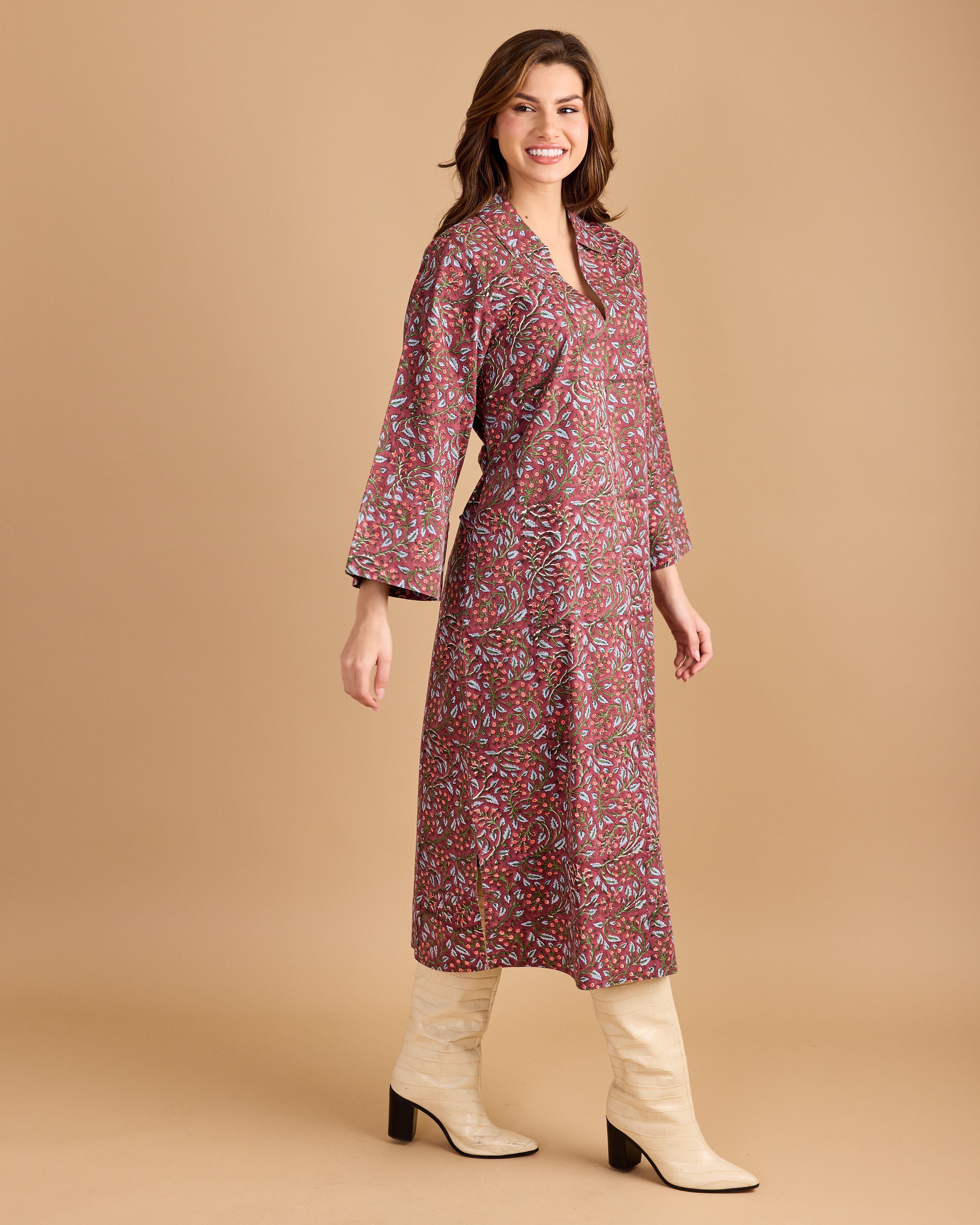 The Lee Dress is a timeless silhouette designed with effortless elegance in mind. Cut in a relaxed midi length, it features wide sleeves, a flattering split neckline, and side slits for easy movement. The allover botanical-inspired print in warm autumn tones makes it perfect for seasonal dressing. Pair it with tall boots for a polished fall look or style it with flats for everyday wear.