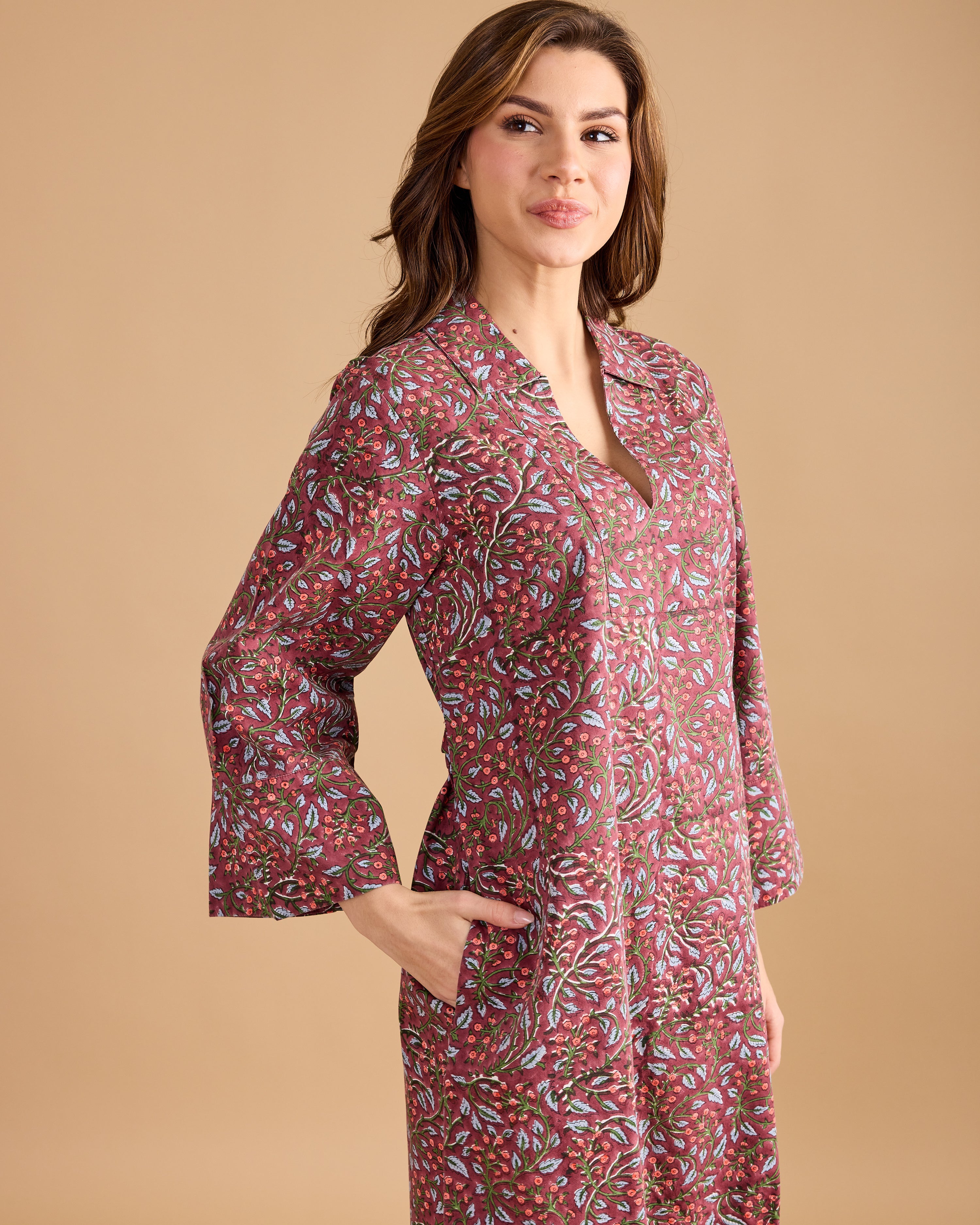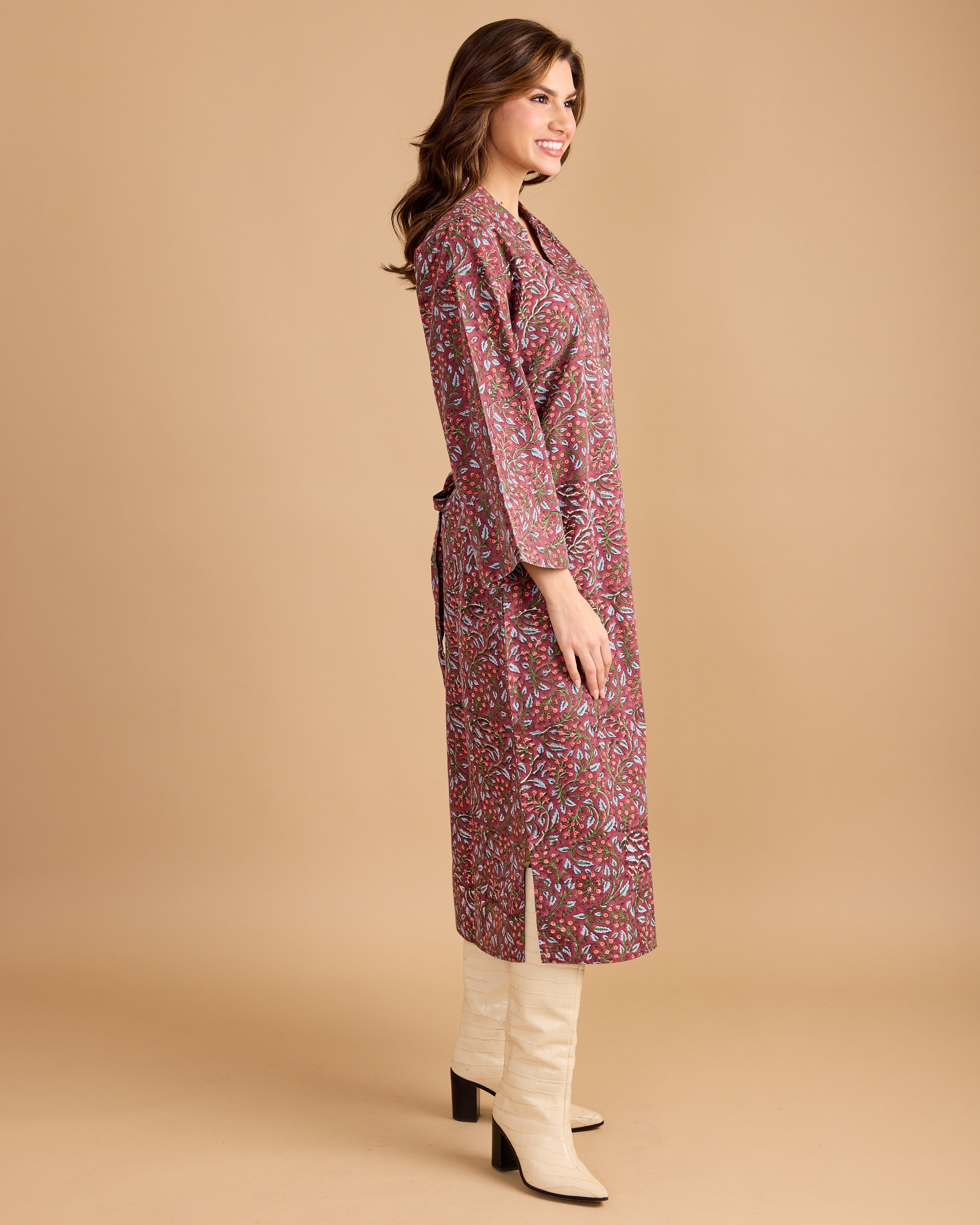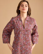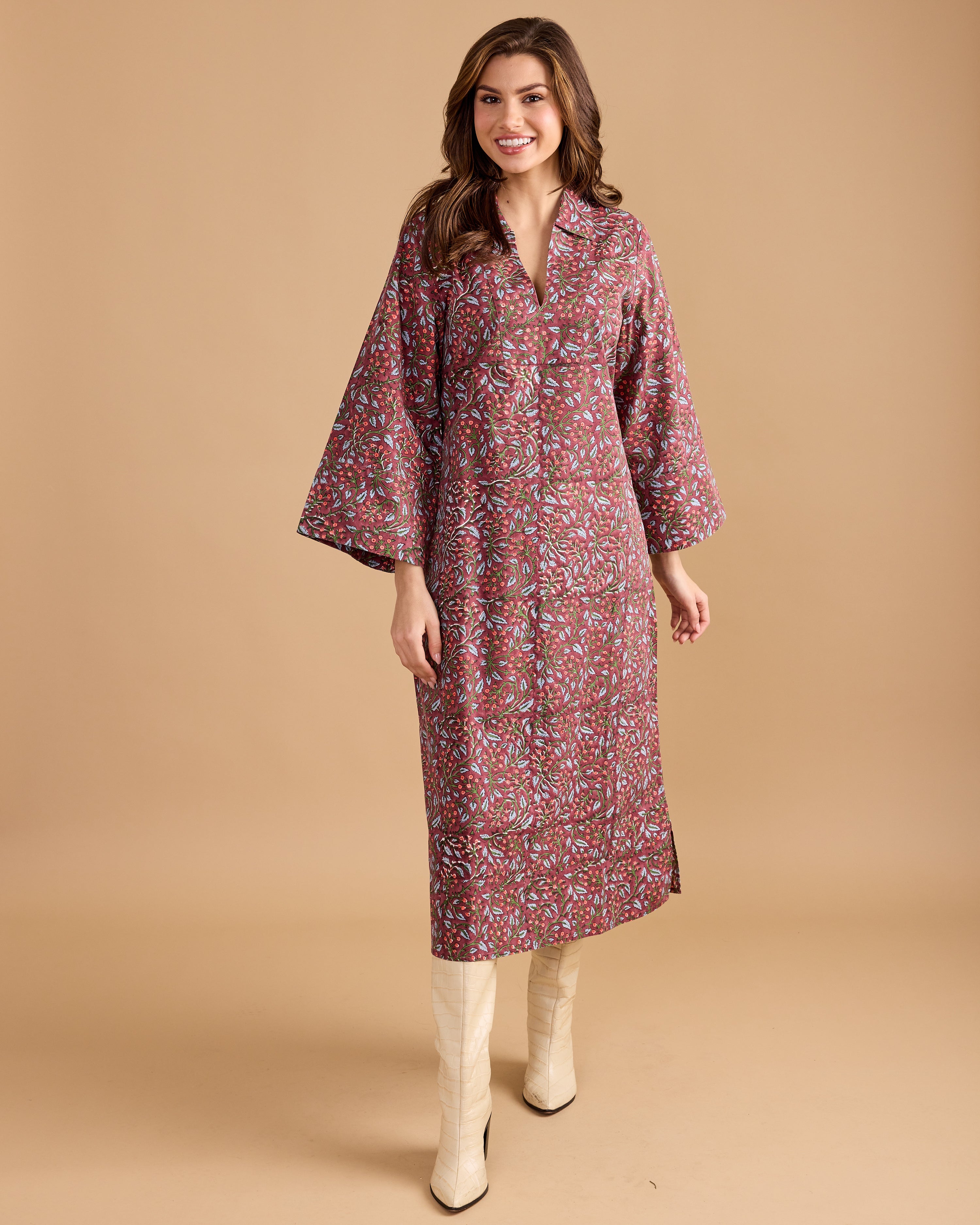 The Lee Dress is a timeless silhouette designed with effortless elegance in mind. Cut in a relaxed midi length, it features wide sleeves, a flattering split neckline, and side slits for easy movement. The allover botanical-inspired print in warm autumn tones makes it perfect for seasonal dressing. Pair it with tall boots for a polished fall look or style it with flats for everyday wear.