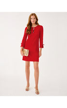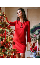 19 1/2" Straight fit, crew neck shift dress with 3/4 length sleeves with keyhole detail, and rhinestone bow detail at neckline and sleeves.