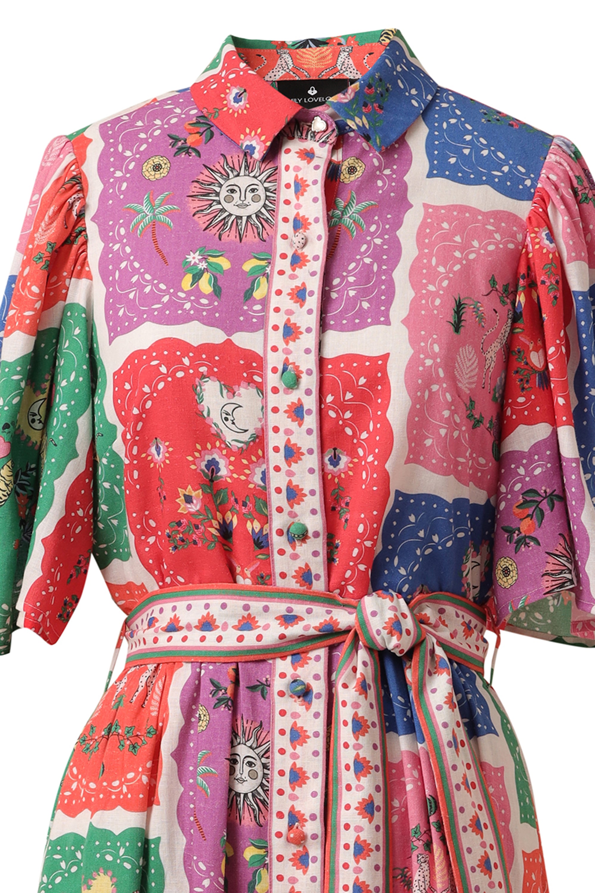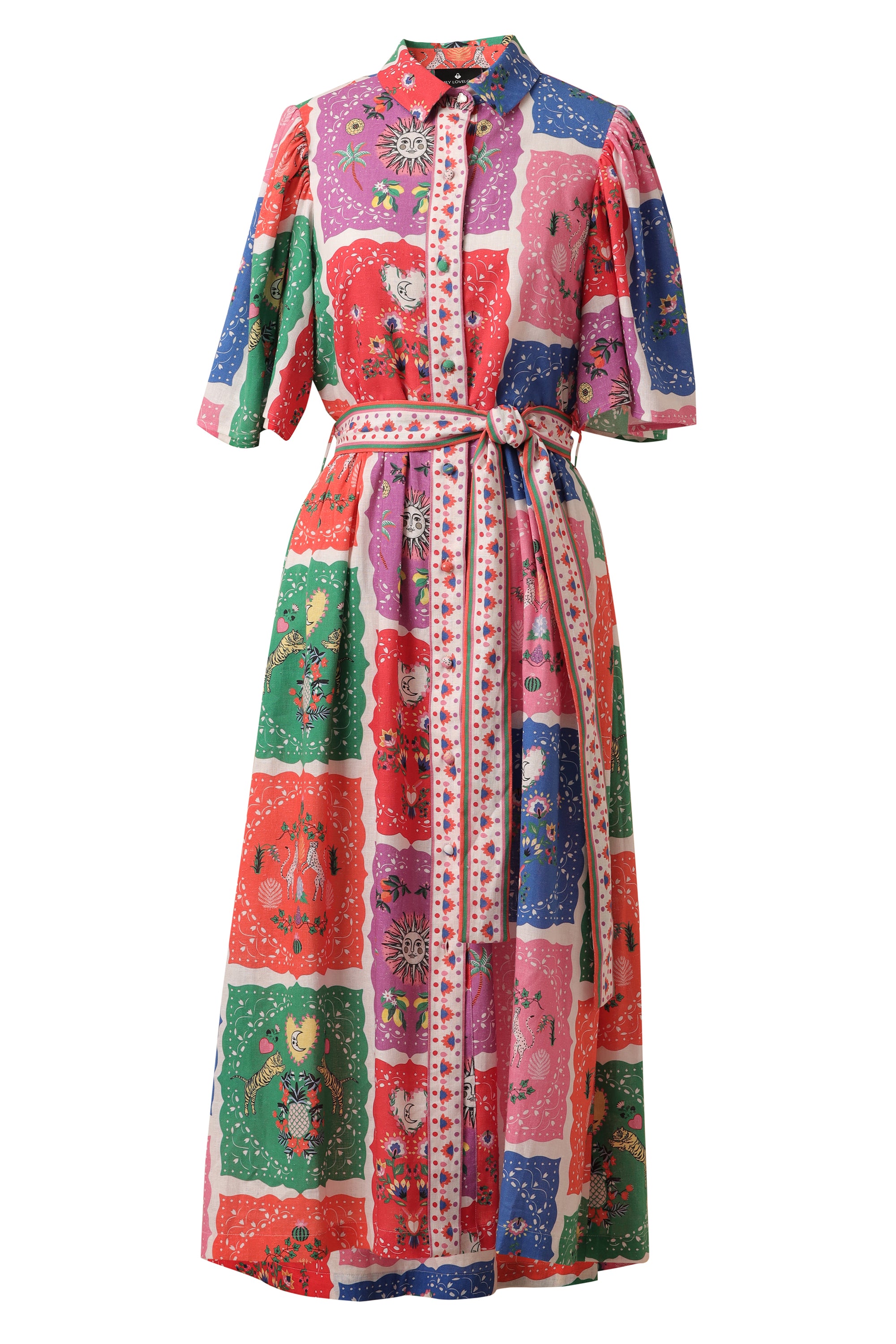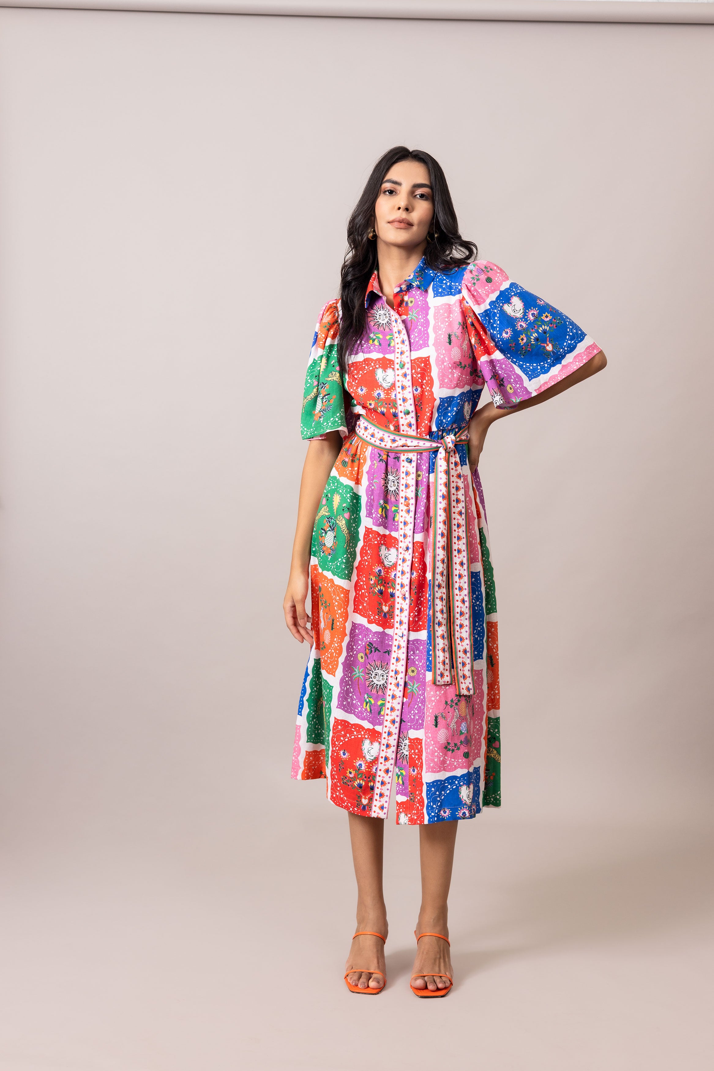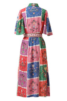 Brighten up your wardrobe with the Melody Scarf Dress, a stunning fusion of vintage charm and modern elegance. This vibrant midi dress features a colorful patchwork print adorned with whimsical motifs, creating a bold yet effortlessly chic aesthetic. The structured button-down silhouette is complemented by short, slightly puffed sleeves and a flattering self-tie belt, allowing you to adjust the fit to your preference. Crafted from breathable fabric, the Melody Scarf Dress is perfect for daytime outings, vacations, or special occasions where you want to make a statement with style.