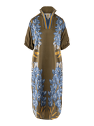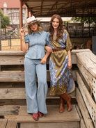 The Poppy Caftan in Bluebonnet is a relaxed yet elevated silhouette that captures the essence of western charm through the Texas state flower. Designed with loose elastic dolman sleeves and a classic stand collar, it drapes effortlessly in a loose-fitting shape that flatters while offering all-day comfort. The curved shirttail hem and side slits add fluidity and ease of movement, while the placed print creates a striking vertical effect that elongates the figure. A versatile piece, the Poppy Caftan transitions seamlessly from day to evening with its effortless sophistication.