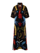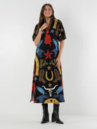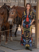 The Poppy Maxi in Lone Star is a bold ode to Texas style, featuring a classic stand collar, loose elastic dolman sleeves, and an effortless, relaxed silhouette that flows into a maxi-length hem. Designed with side slits for ease of movement and subtle allure, this style also includes practical front slit pockets. The Lone Star print captures the spirit of the West with iconic Texan symbols layered in vibrant color for a striking effect. Finished with a curved shirt-tail hem, this maxi brings a touch of western edge while staying true to feminine, easy elegance.