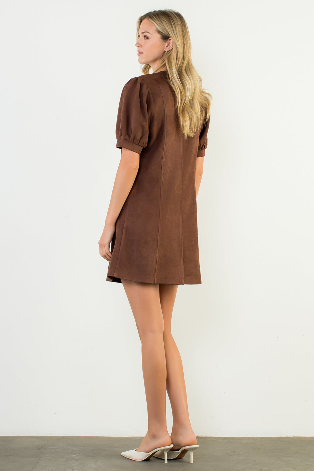 Crafted from a supple faux-suede fabric, this dress offers a smooth, velvety feel with just the right amount of structure. The warm brown hue evokes cozy fall days and works beautifully as a neutral base for endless styling options. Its above-the-knee length gives it a playful edge while keeping the look refined and versatile enough for daytime or evening wear.