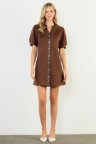 Puff Sleeve V-Neck Button Up Suede Dress - Brown