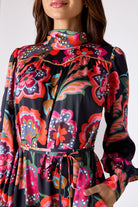 Make an entrance in the Ryder Dress, a statement-making midi designed with vibrant confidence. Featuring a high neckline, long sleeves, and a flattering tie waist, this dress blends timeless elegance with bold personality. The flowing silhouette is adorned with a striking floral print in rich shades of red, pink, teal, and orange against a deep backdrop—perfect for standing out at any occasion. Effortlessly chic, the Ryder Dress transitions seamlessly from day to night.