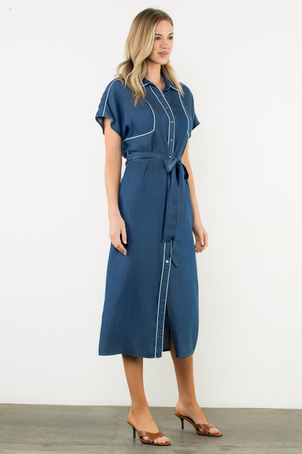 A self-tie belt cinches the waist for a customizable fit, letting you accentuate your shape or wear it loose for an easygoing vibe. This thoughtful design element creates versatility, allowing the dress to shift seamlessly from daytime casual to evening polished. The button-up construction also offers styling flexibility — wear it fully buttoned for a streamlined look or leave a few buttons open at the neckline or hem to create a breezier feel.