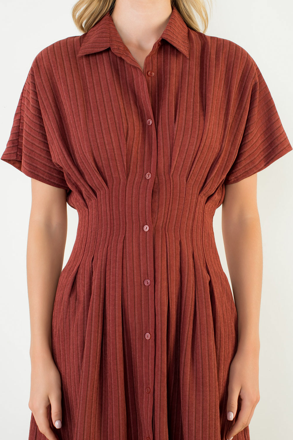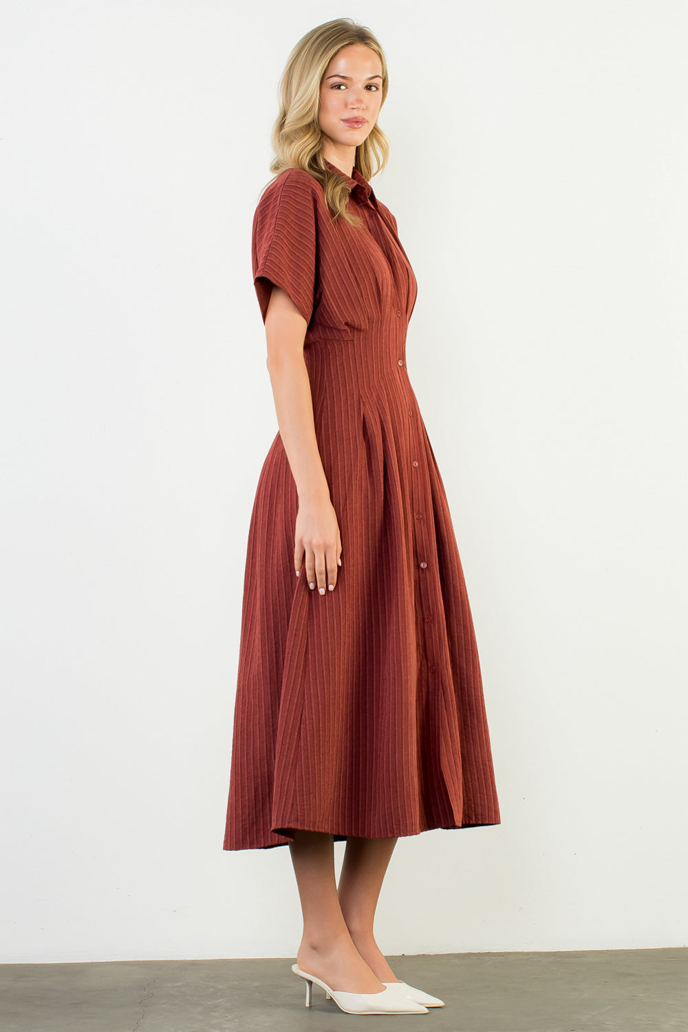 Sophisticated yet effortless, this rust-toned midi dress features all-over vertical pleating that flatters the silhouette with beautiful movement. Designed with a classic collared neckline, short sleeves, and a button-down front, it offers both polish and ease. Side pockets add a functional touch, while the relaxed fit makes it perfect for day-to-night wear. Pair with flats for casual outings or heels for an elevated look.