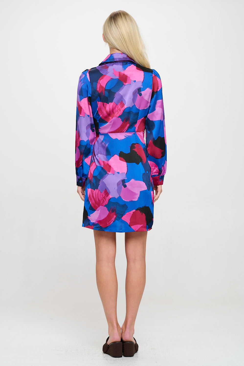 Stand out in this vibrant abstract print wrap dress, featuring a striking mix of bold colors like deep blue, purple, and fuchsia. The wrap-style design with a tie waist creates a flattering silhouette, perfect for a variety of occasions. The dress is finished with a V-neckline and long sleeves with subtle cuffs, adding a touch of elegance. Whether you're dressing up for a night out or adding a pop of color to your day, this dress is sure to turn heads.