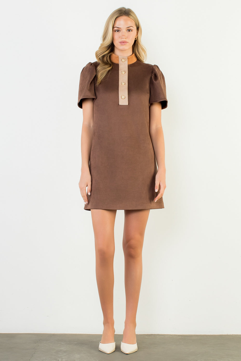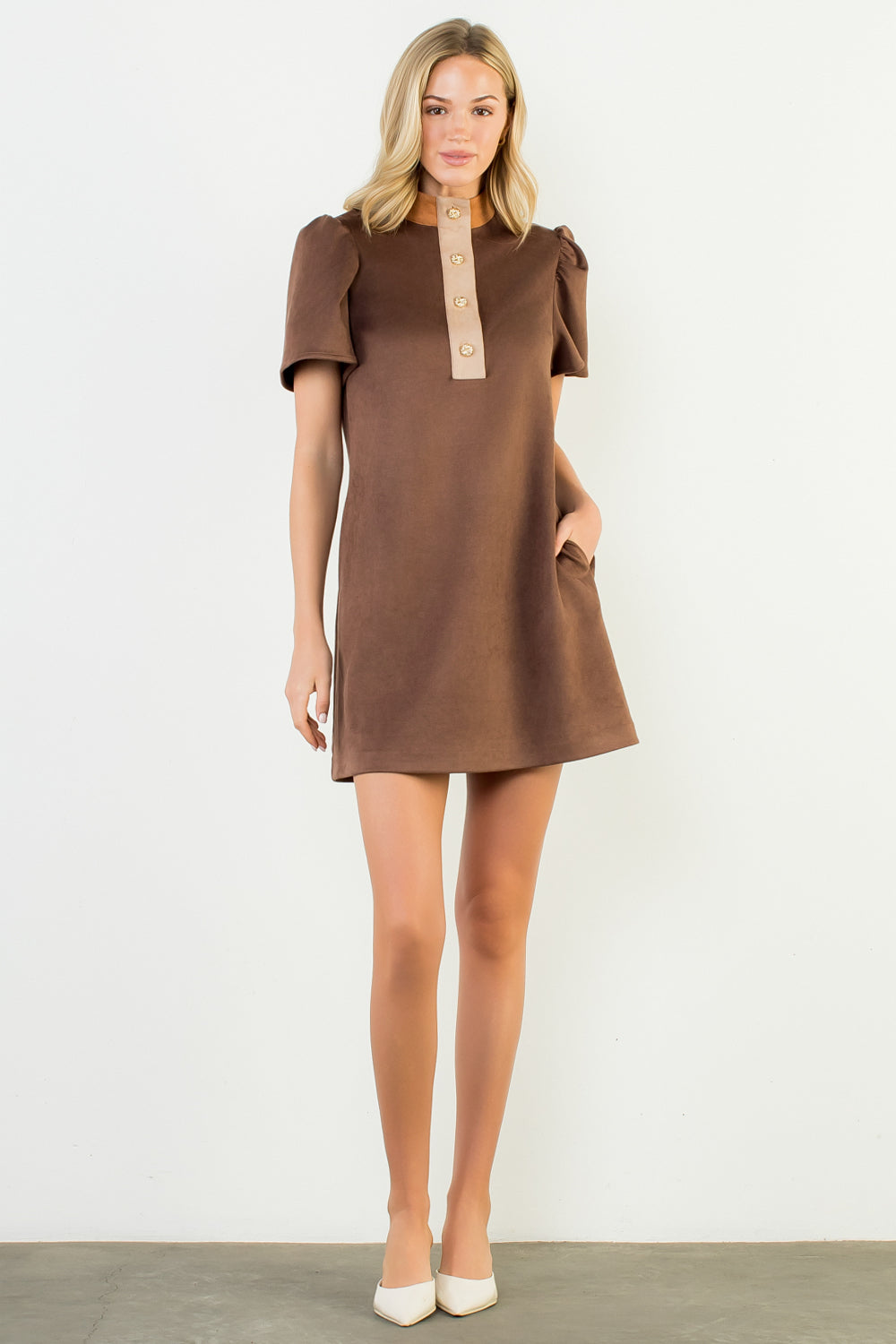 Crafted from a supple faux-suede fabric, this dress offers a smooth, velvety touch that drapes beautifully over the body while maintaining structure. Its lightweight yet plush feel makes it ideal for transitional weather — cool enough for warm days yet cozy enough to layer as the seasons change. The short sleeves balance the sleek silhouette, while the short hemline adds a playful and youthful edge.