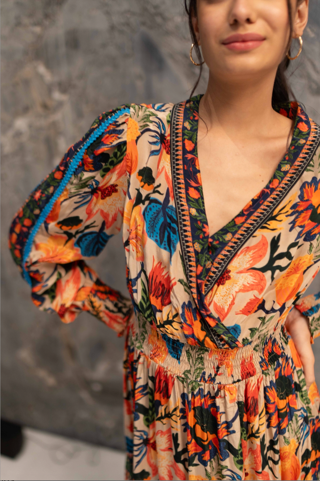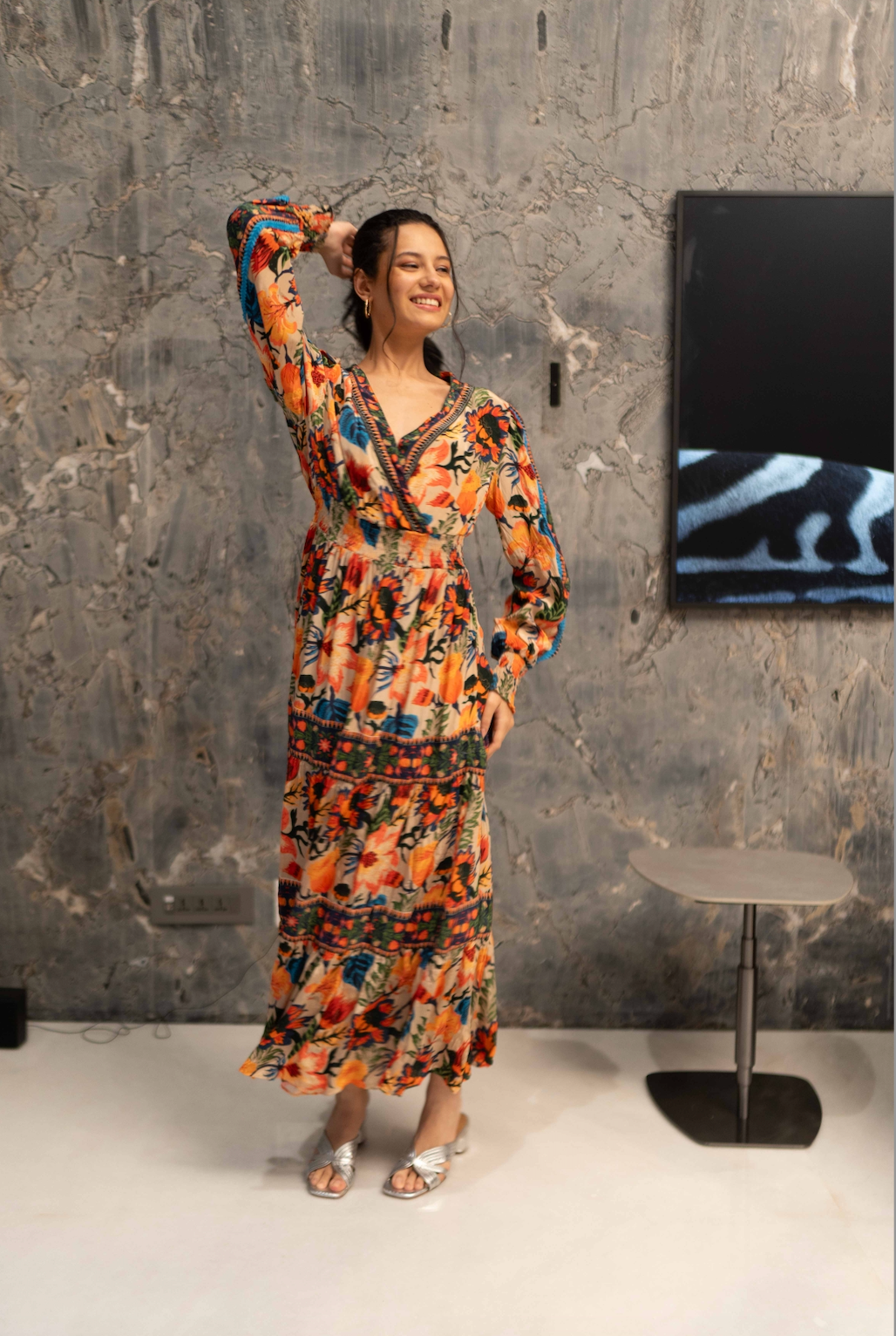 Step into effortless elegance with our Vera Maxi Dress. Featuring a flattering wrap-style neckline, long sleeves, and a flowing tiered skirt, this vibrant dress is adorned with a bold floral print in shades of orange, blue, and green. The smocked waistband adds a touch of definition, making it perfect for both daytime outings and evening gatherings. Pair it with sandals for a relaxed look or dress it up with heels for a night out.