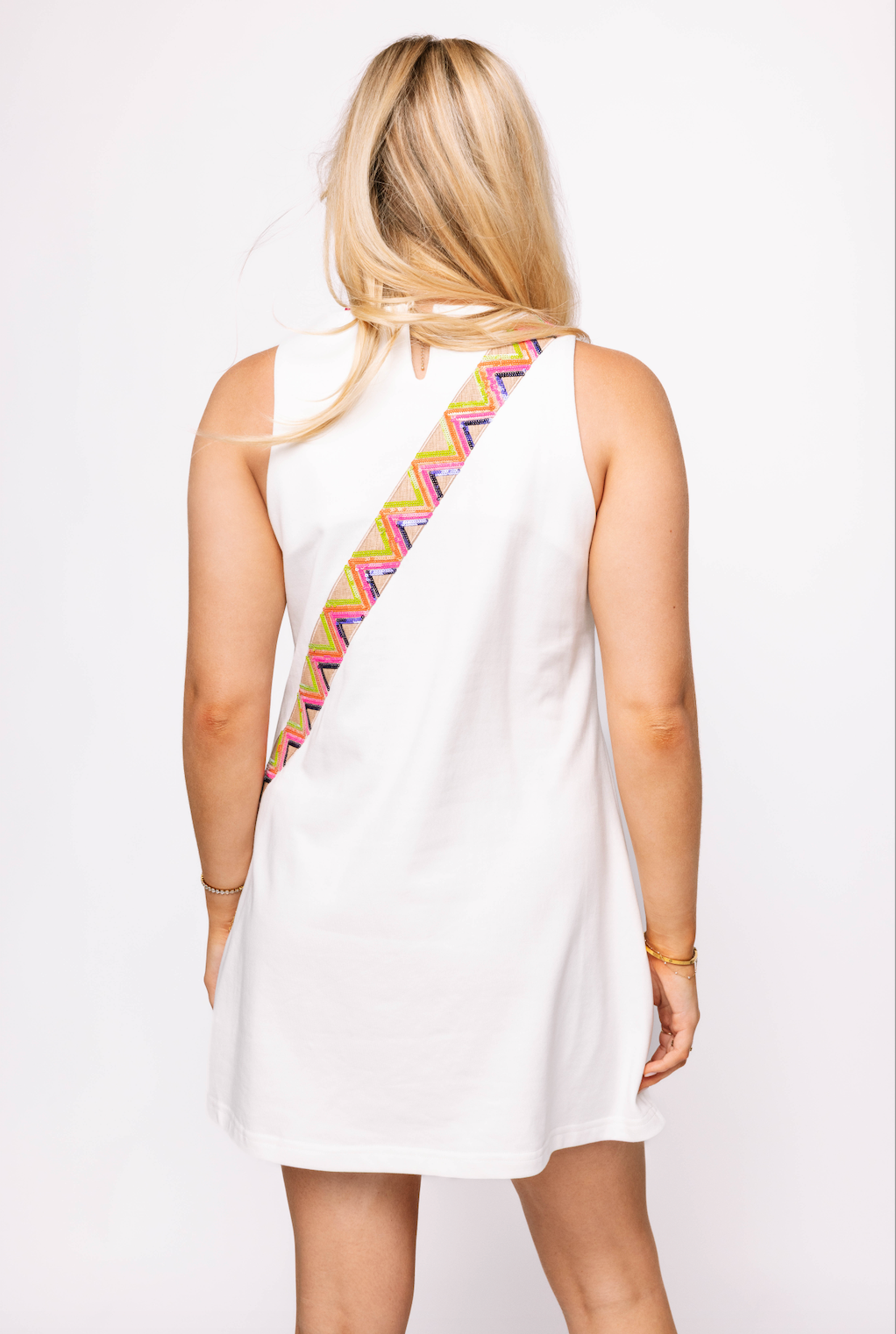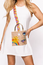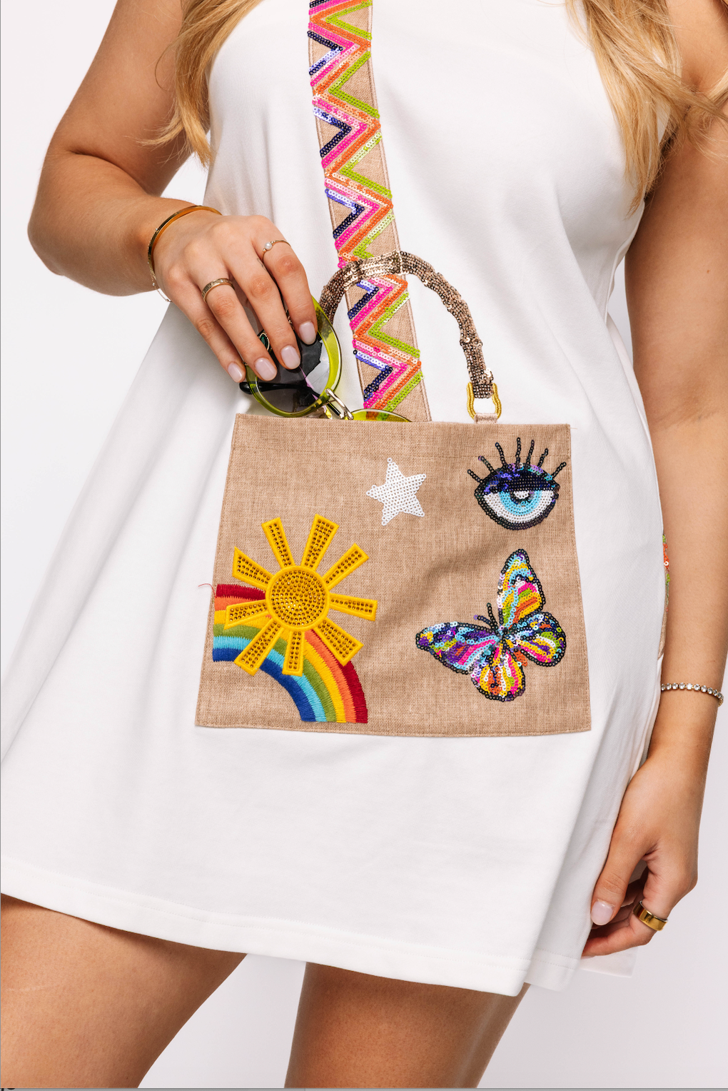Step into sunshine with this fun and functional White Icon Crossbody Purse Tank Dress! This easy-to-wear white tank dress features a built-in statement pocket bag, fully functional and designed right into the silhouette. Embellished with bold, beaded appliqués—a cheerful sun, vibrant rainbow, butterfly, star, and eye—this dress carries your essentials while making a playful style statement.