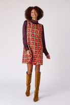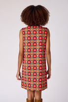 Retro charm meets modern chic in the Zaire Dress. This sleeveless shift dress features a bold mod-inspired daisy print in vibrant shades of red, pink, and olive, perfectly accented with a playful wavy trim and gold button detailing down the front. Its tailored-yet-relaxed silhouette makes it easy to style for both casual outings and elevated occasions. Pair with boots for a standout fall look or keep it classic with flats—either way, the Zaire Dress is a head-turner.