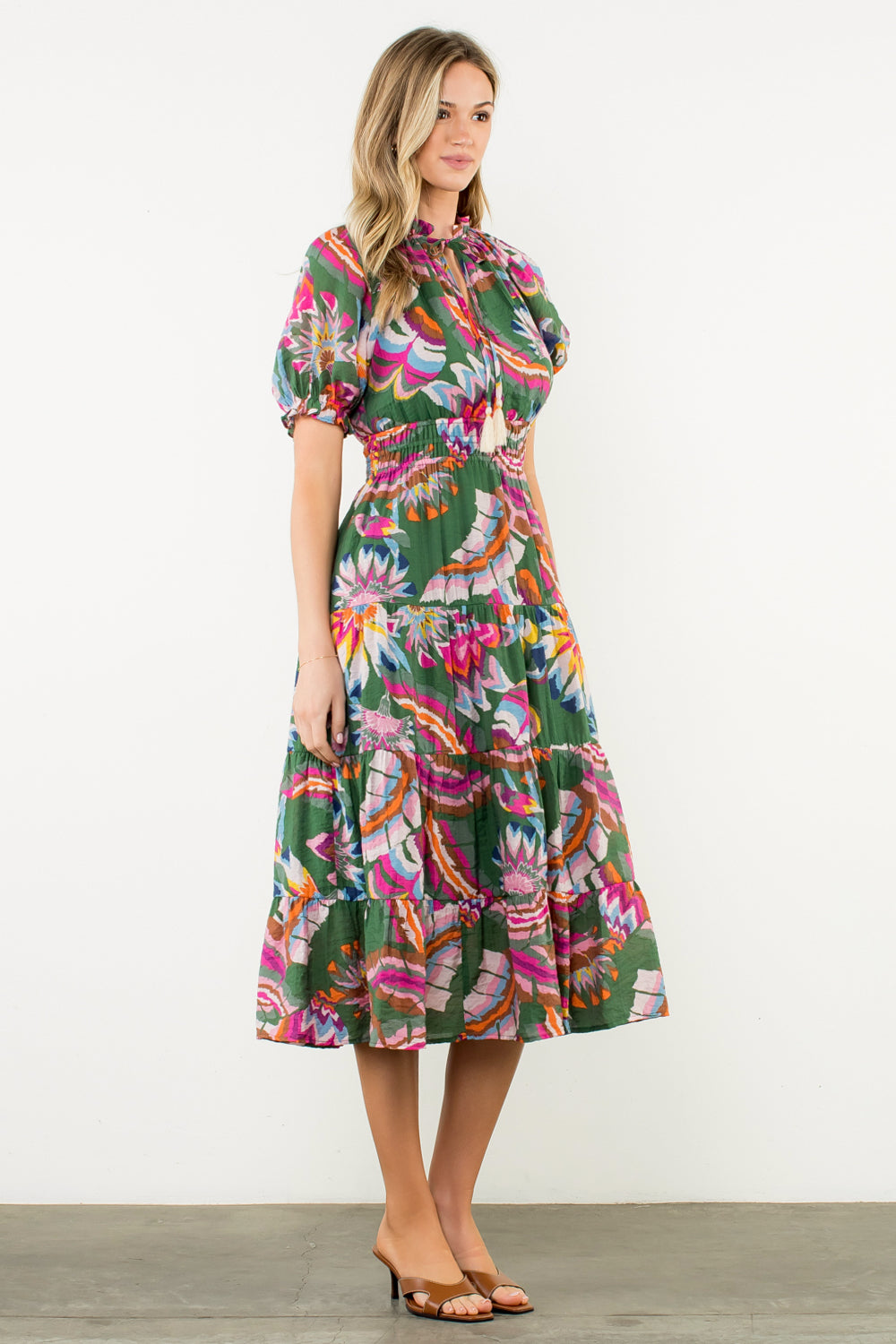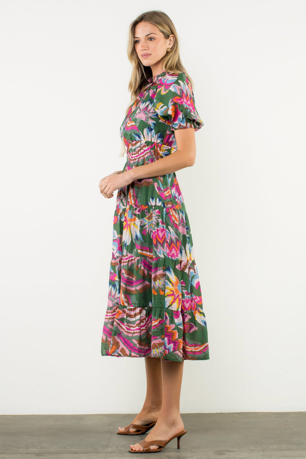 Puff Sleeve Print Tiered Maxi Dress - Green