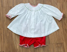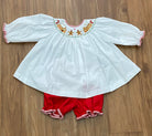 Sweet holiday charm meets timeless Southern style in the Emma Smocked Bloomer Set - Gingerbread Red by Lulu Bebe. This classic two-piece ensemble features a beautifully smocked top adorned with delicate hand-embroidered gingerbread motifs, perfectly capturing the warmth and joy of the holiday season. The rich red hue adds a festive touch, while the soft cotton fabric ensures all-day comfort for your little one.