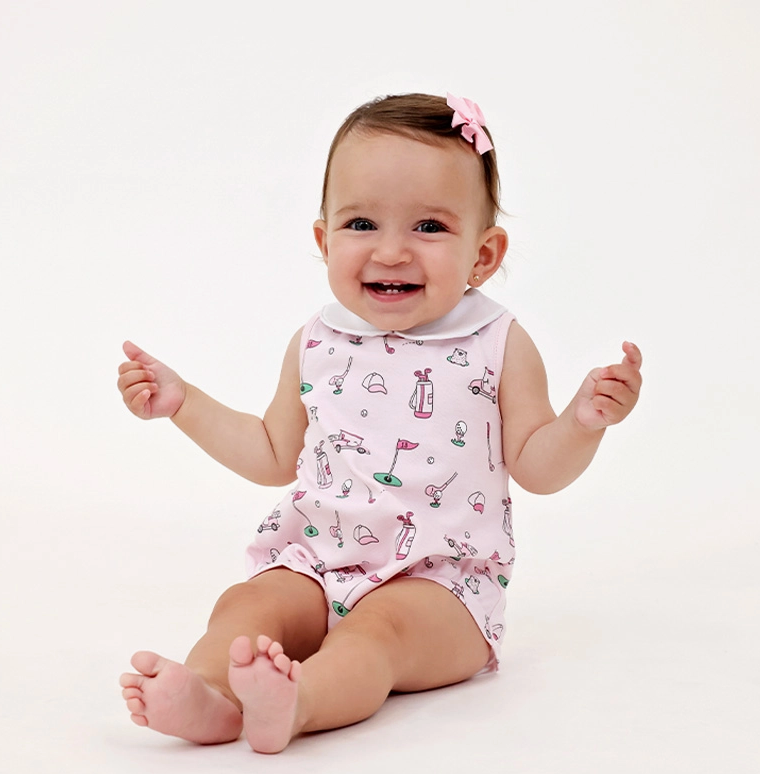 We're not kidding when we say we're obsessed with this adorable pink bubble romper complete with a Peter Pan collar, and a sleeveless airy top! Add that cuteness to our new golf-inspired print, and you've got a hole-in-one for an ideal baby shower gift! Made of 100% Pima cotton Breathable and hypoallergenic Machine wash cold, tumble dry Ships in 1-2 business days.