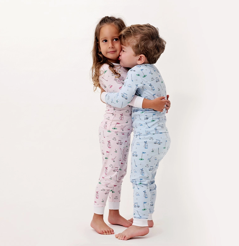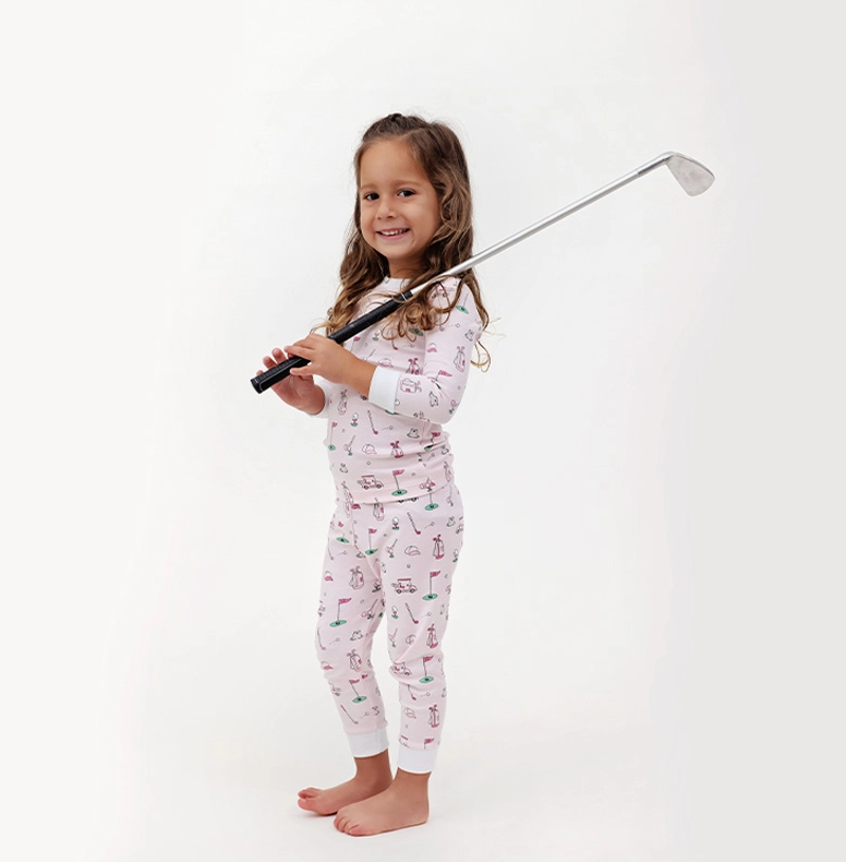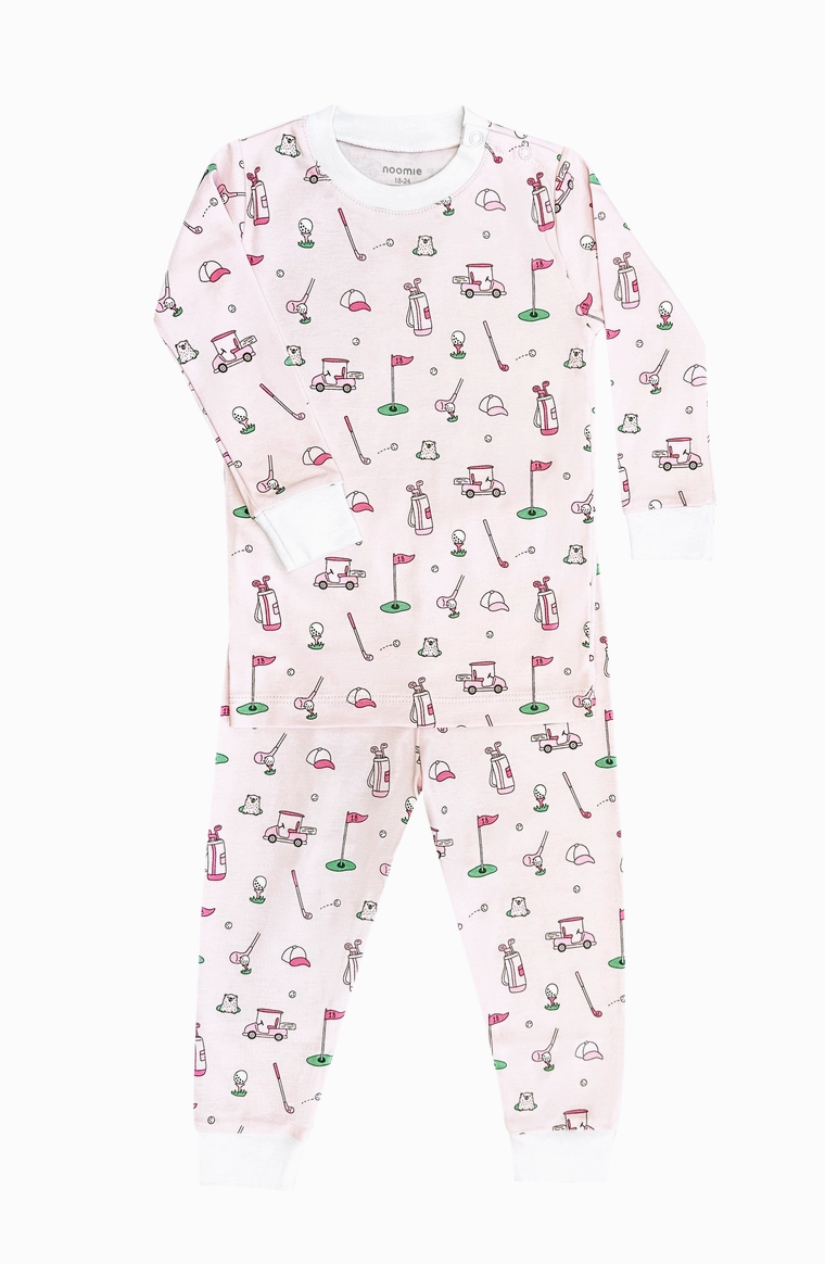 Get your little sports fan ready for golfing season in this adorable pink 2-piece pajama set! Made from 100% Pima Cotton and covered throughout in golf carts, golf clubs, and more! These cozy pajamas boasts white trim, long sleeves, and fitted pull-on pants. Made of 100% Pima cotton Breathable and hypoallergenic Machine wash cold, tumble dry Shoulder snap for sizes 12-18 and 18-24 Ships in 1-2 business days Fits snug to comply with safety regulations