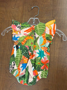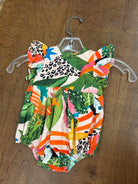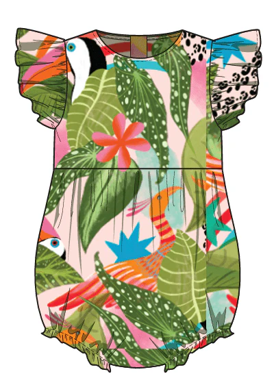 Introducing the Baby Harmony Bubble! This adorable onesie features playful ruffle details at the sleeves and legs. The colorful tropical print will have your little one looking cute and ready for a day of fun in the sun. Perfect for capturing those memorable moments!