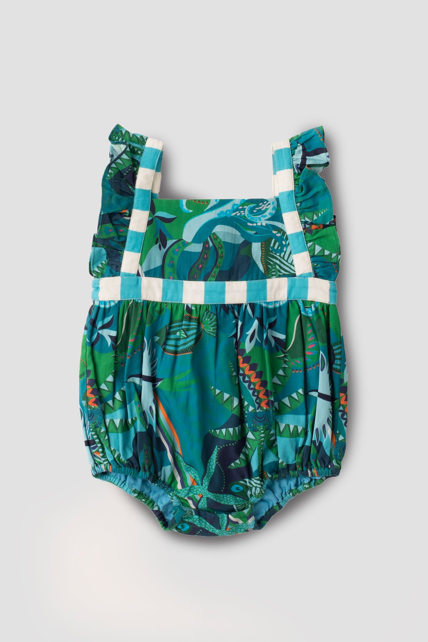 Brighten up your little one's summer wardrobe with this playful jungle-print bubble romper! Featuring vibrant shades of green and teal with pops of orange and blue, this one-piece is full of fun tropical flair. Ruffle-trimmed straps and bold striped detailing add a charming, whimsical touch, while the gathered elastic leg openings ensure a comfy fit for all-day play. Perfect for warm-weather adventures or vacation photo ops!