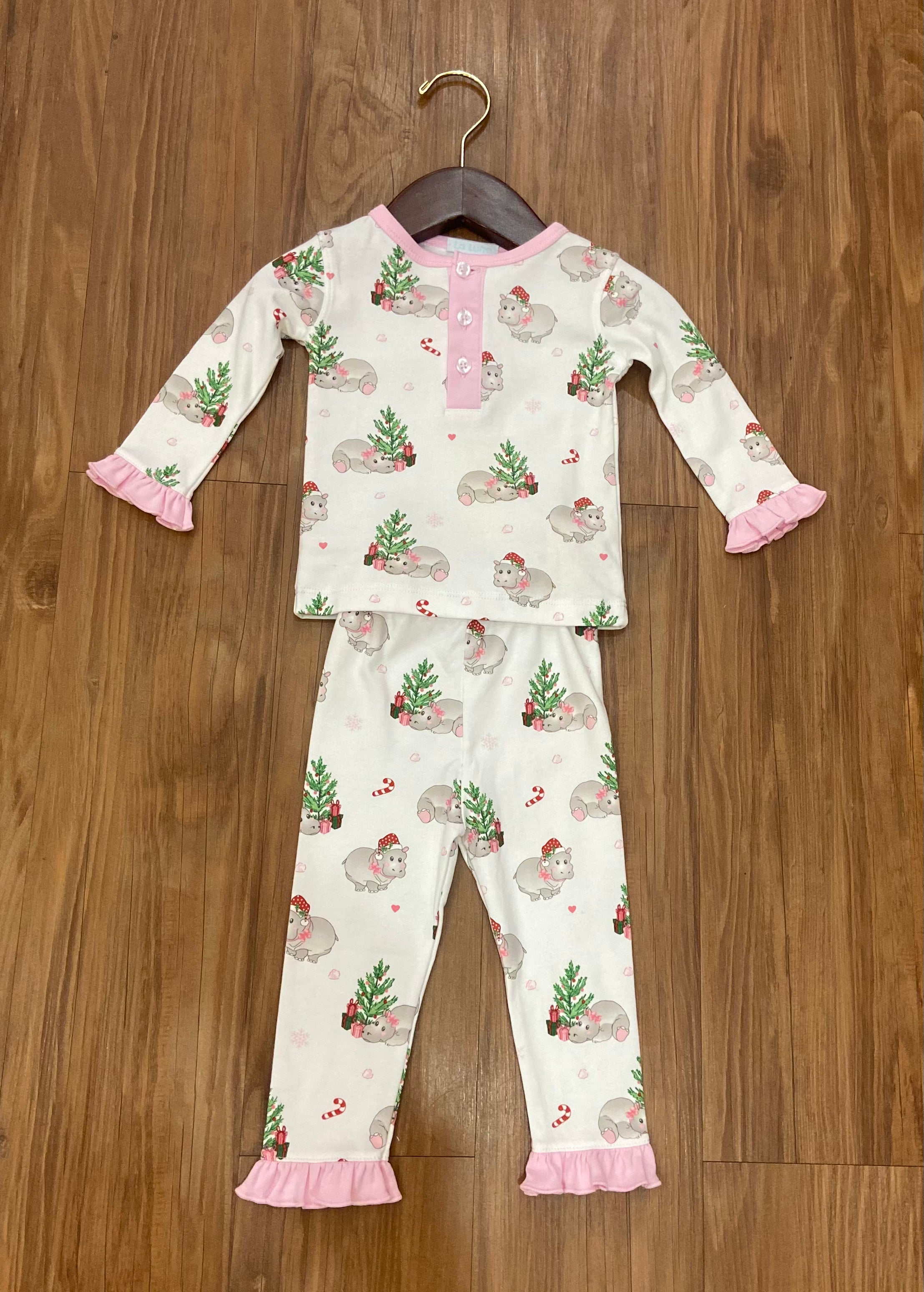 The two-piece set features a long-sleeve top and coordinating pajama pants, both beautifully designed with an adorable hippo print that adds a whimsical, cheerful flair to bedtime. The gentle pastel tones and charming hand-drawn style of the hippos bring a sense of fun and imagination to her nighttime routine. Every detail is carefully considered—from the finely ribbed cuffs that help keep sleeves and pant legs in place, to the softly elasticized waistband that provides a snug yet comfortable fit without pinching or irritation.