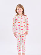 Stay cozy in style with this playful pajama set! Featuring a relaxed long-sleeve top and matching wide-leg pants, this ultra-soft set is adorned with a cheerful pink, orange, and red fruit print on a creamy white background. The lightweight fabric and easy fit make it perfect for lounging, sleeping, or sipping your morning coffee in comfort. Designed with a touch of stretch for all-night ease, this set is your new go-to for laid-back luxury.