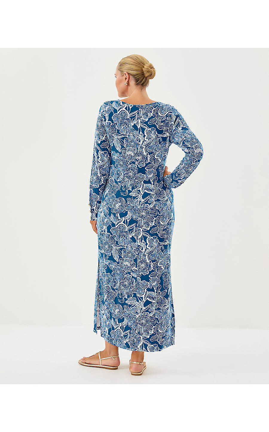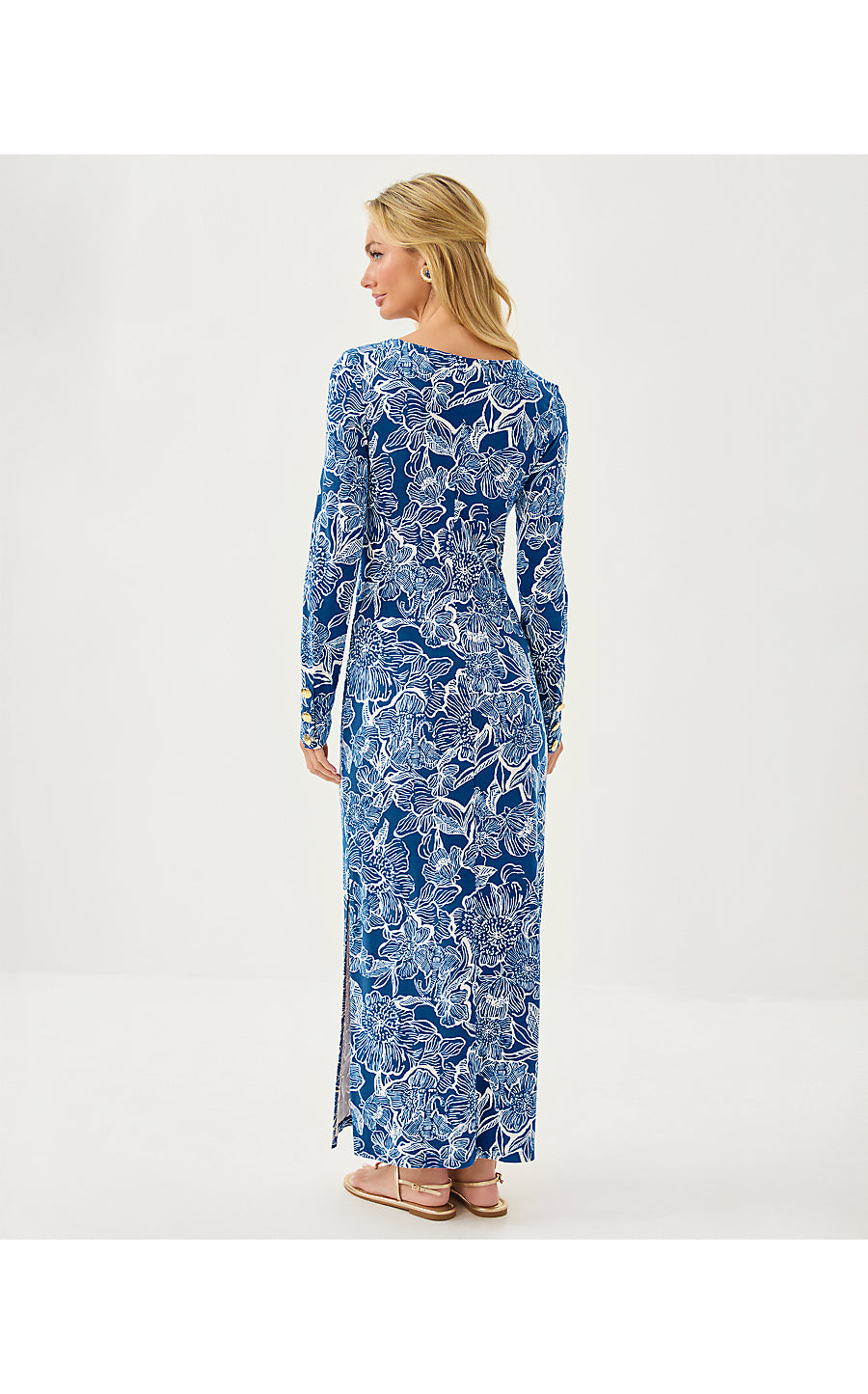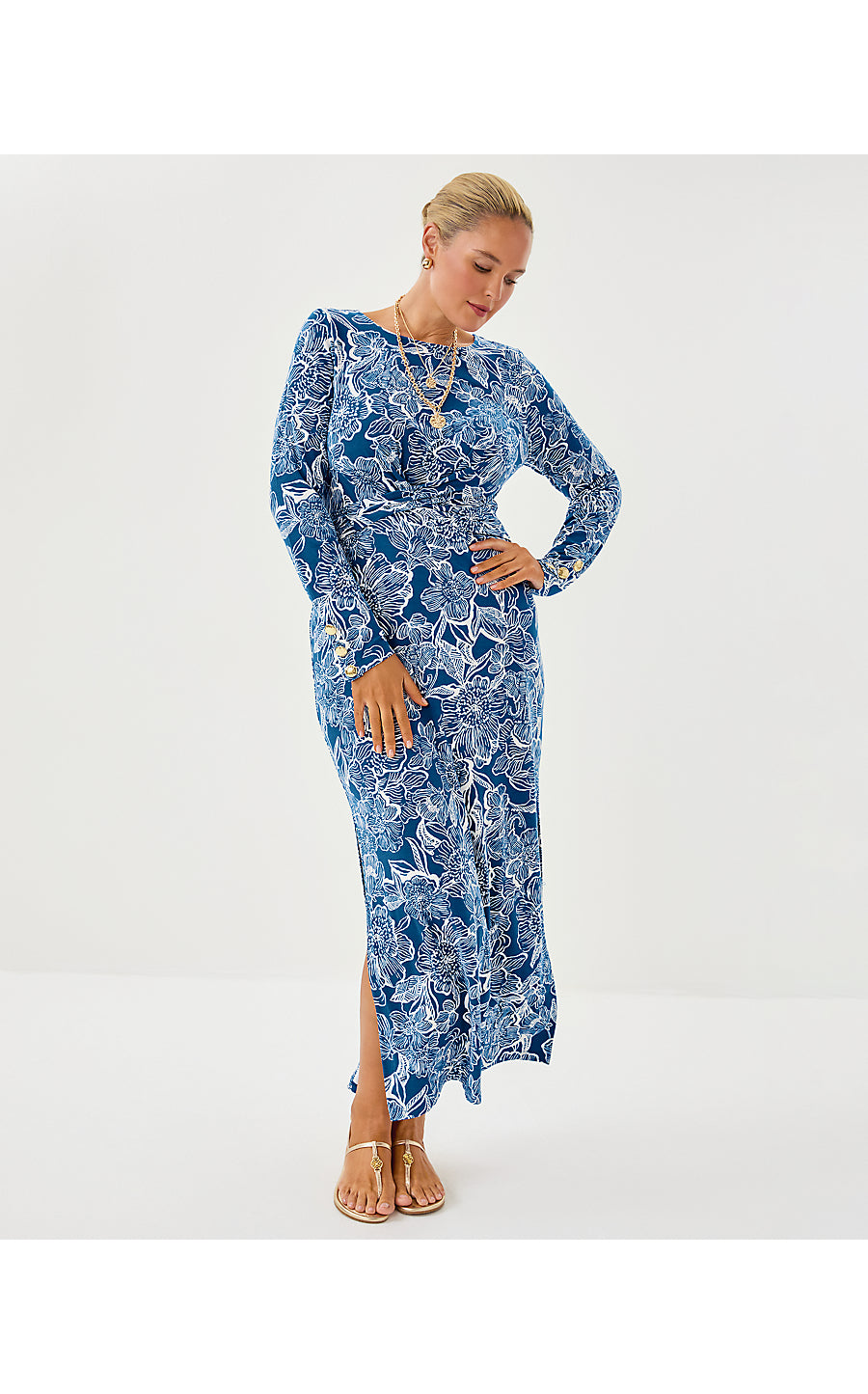 • Fitted, crew neck maxi dress with a faux wrap bodice detail, long sleeves with large gold buttons, and side slits.
