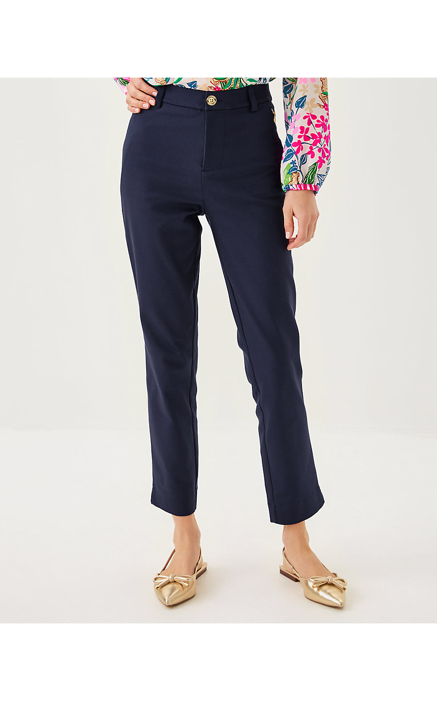 - High rise, ankle-length pant with a straight fit.