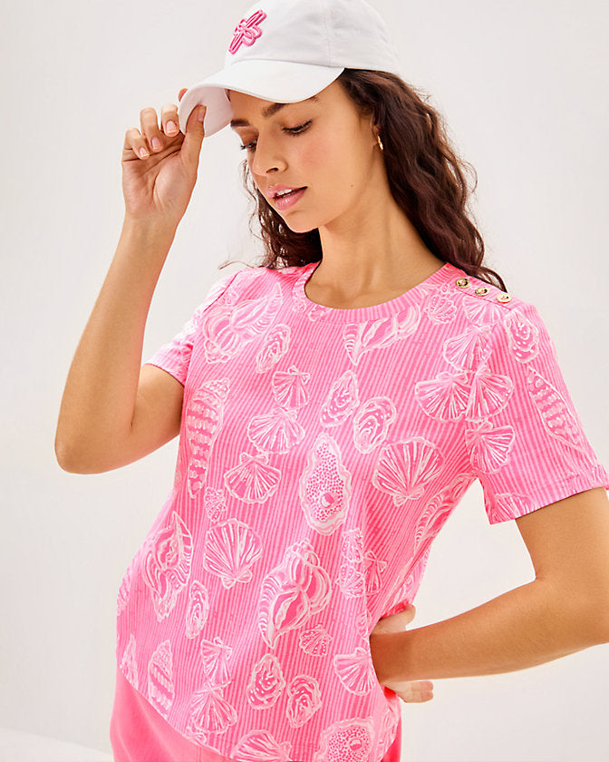 - Straight fit top with a crew neckline, short sleeves, and buttons at the shoulder.