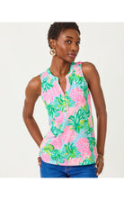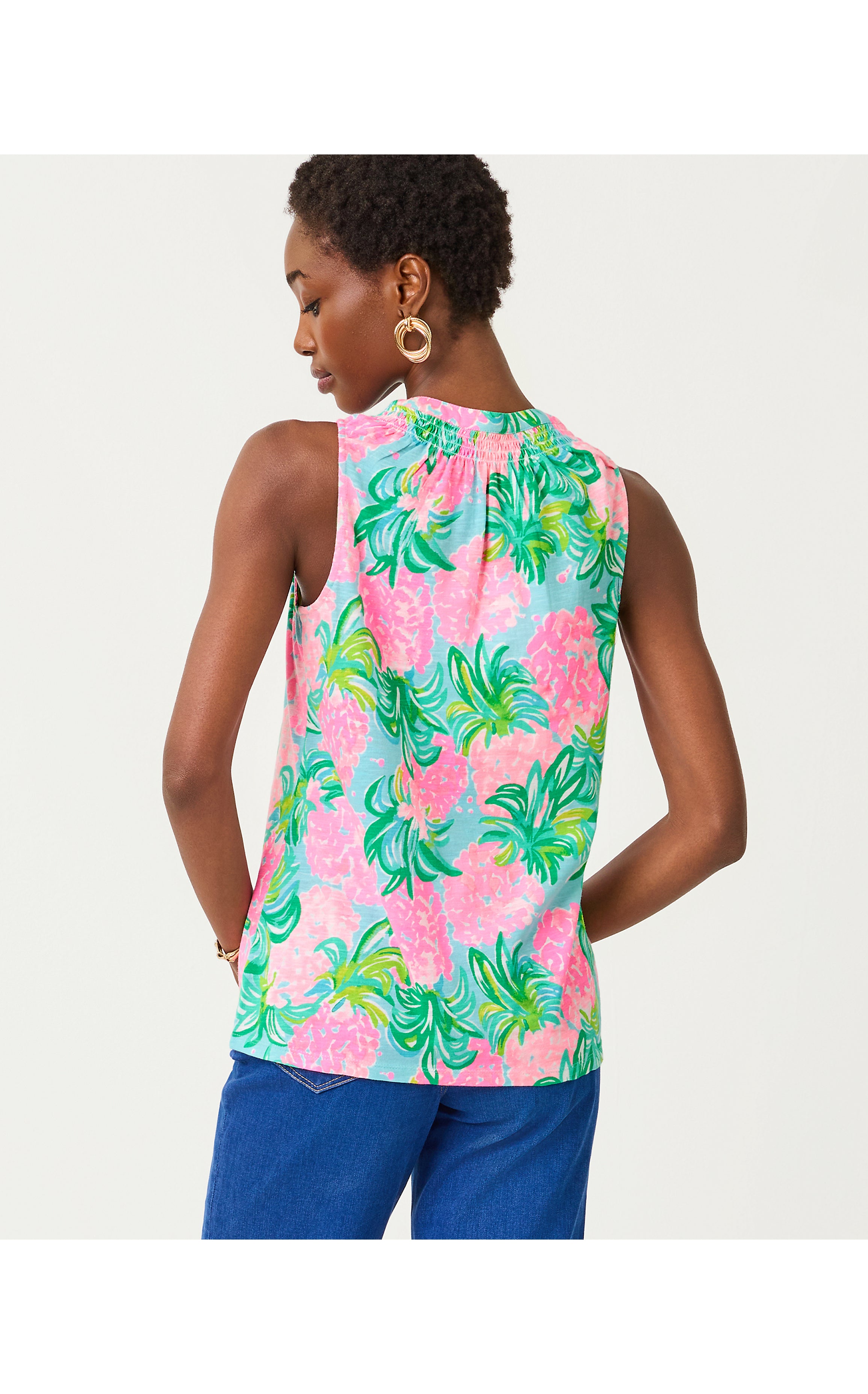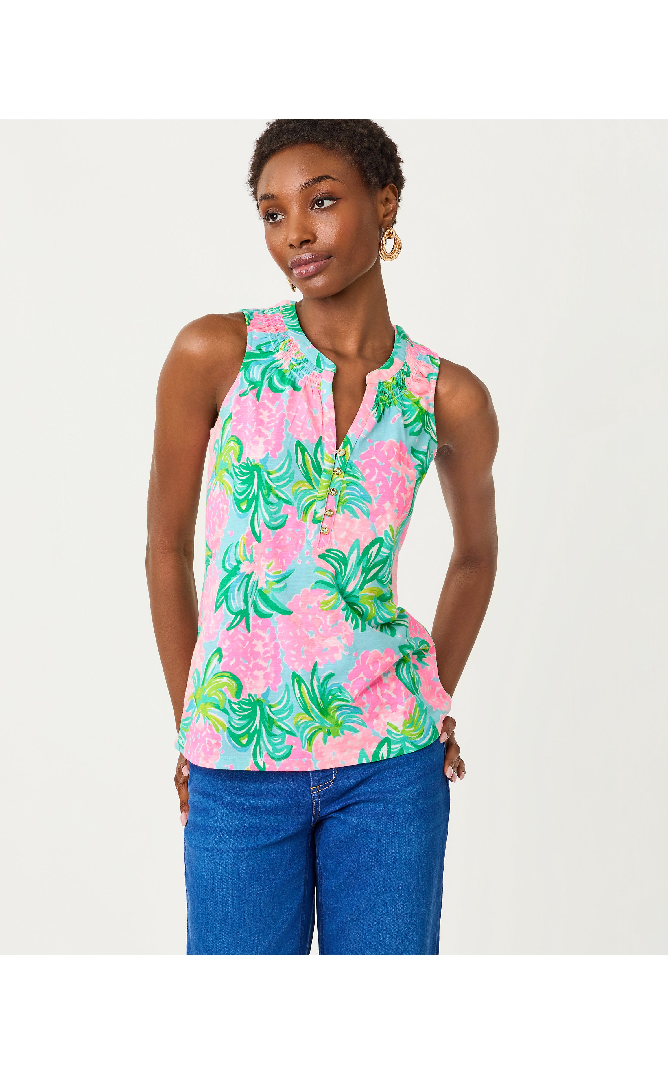 Easy fit, bra-friendly, sleeveless top with button front placket and smocked neckline detail.
