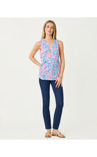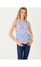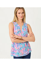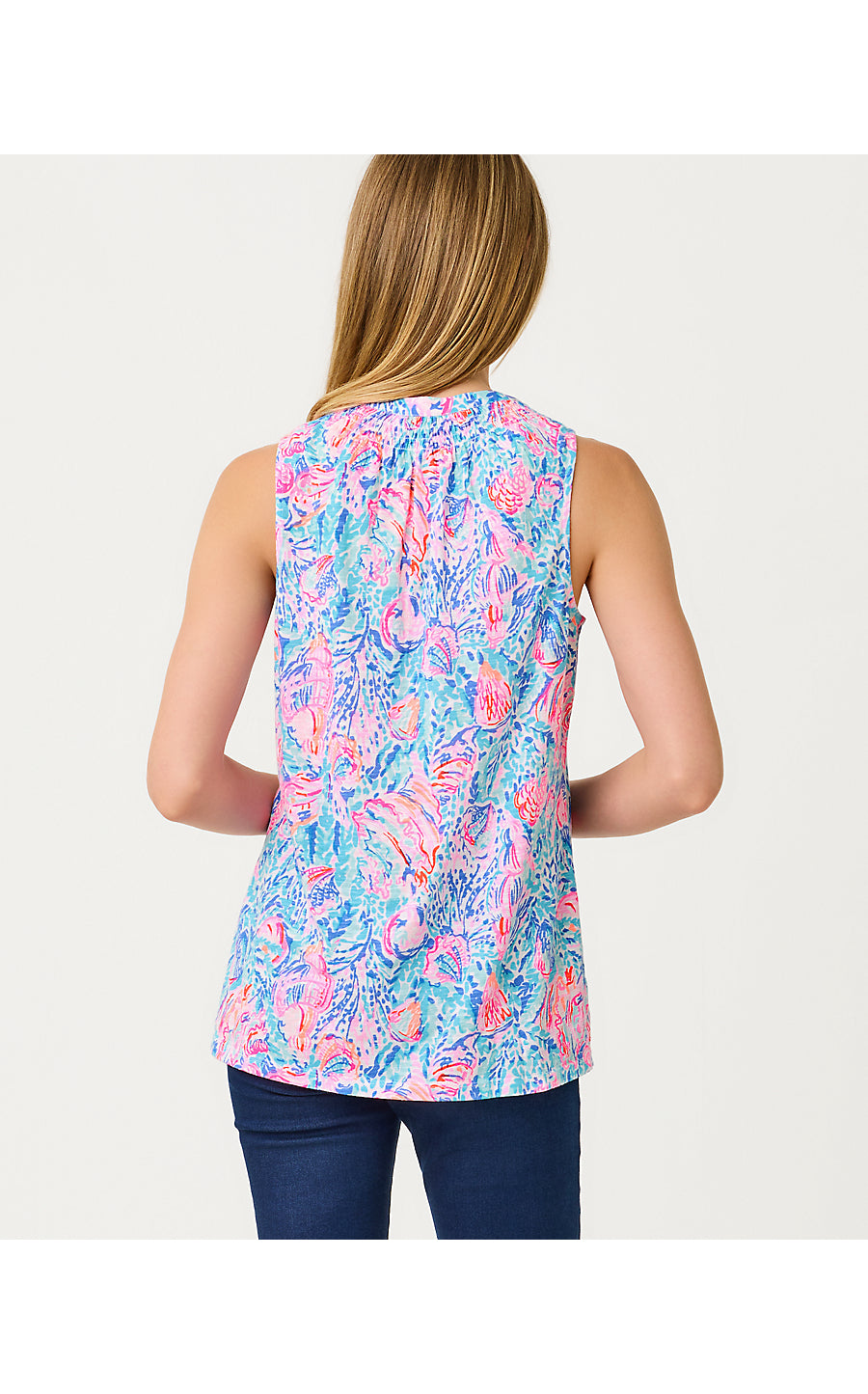 Easy fit, bra-friendly, sleeveless top with button front placket and smocked neckline detail.