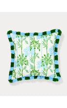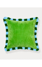 - Printed pillow cover with a velvet back, striped fringe, and an invisible zipper.