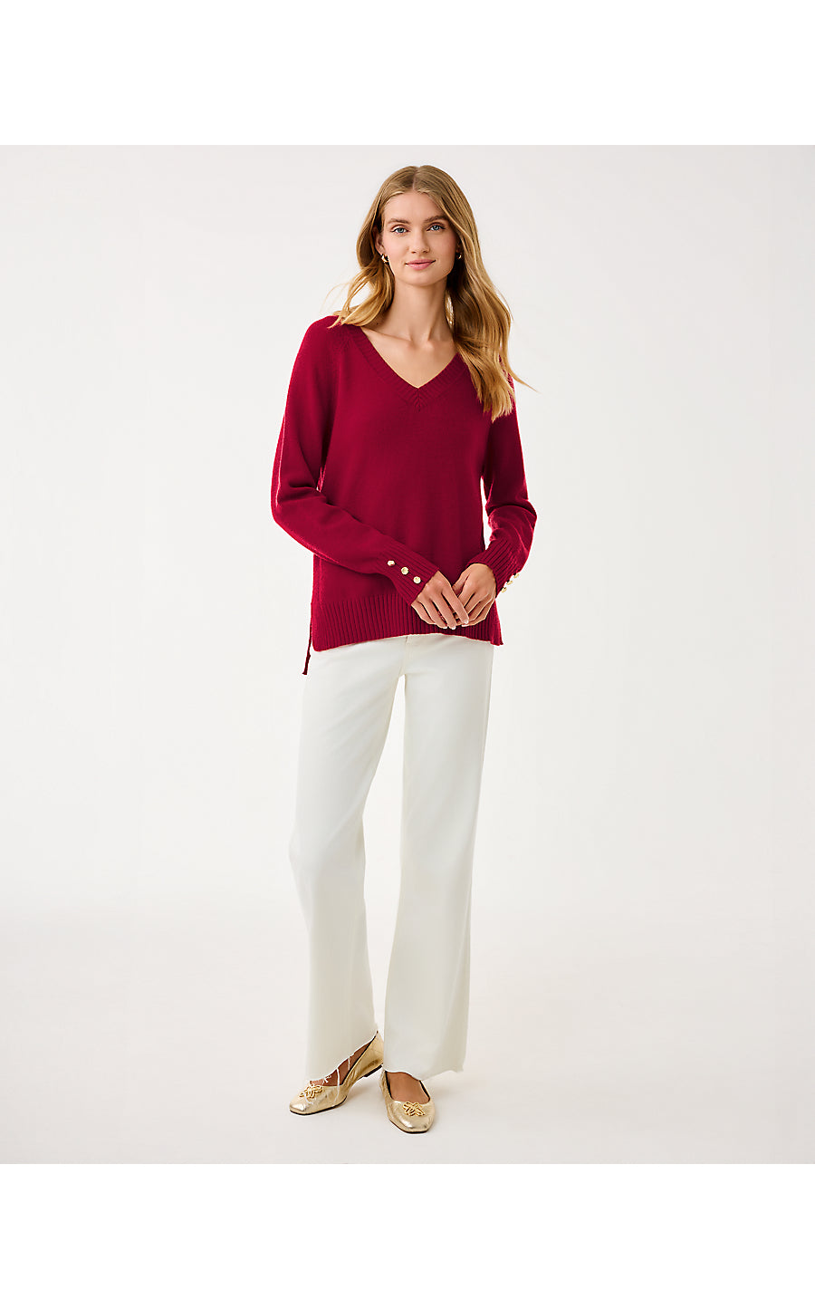 - Easy fit, v-neck sweater with a stepped hem, raglan sleeves, side slits, and buttons at the cuff.