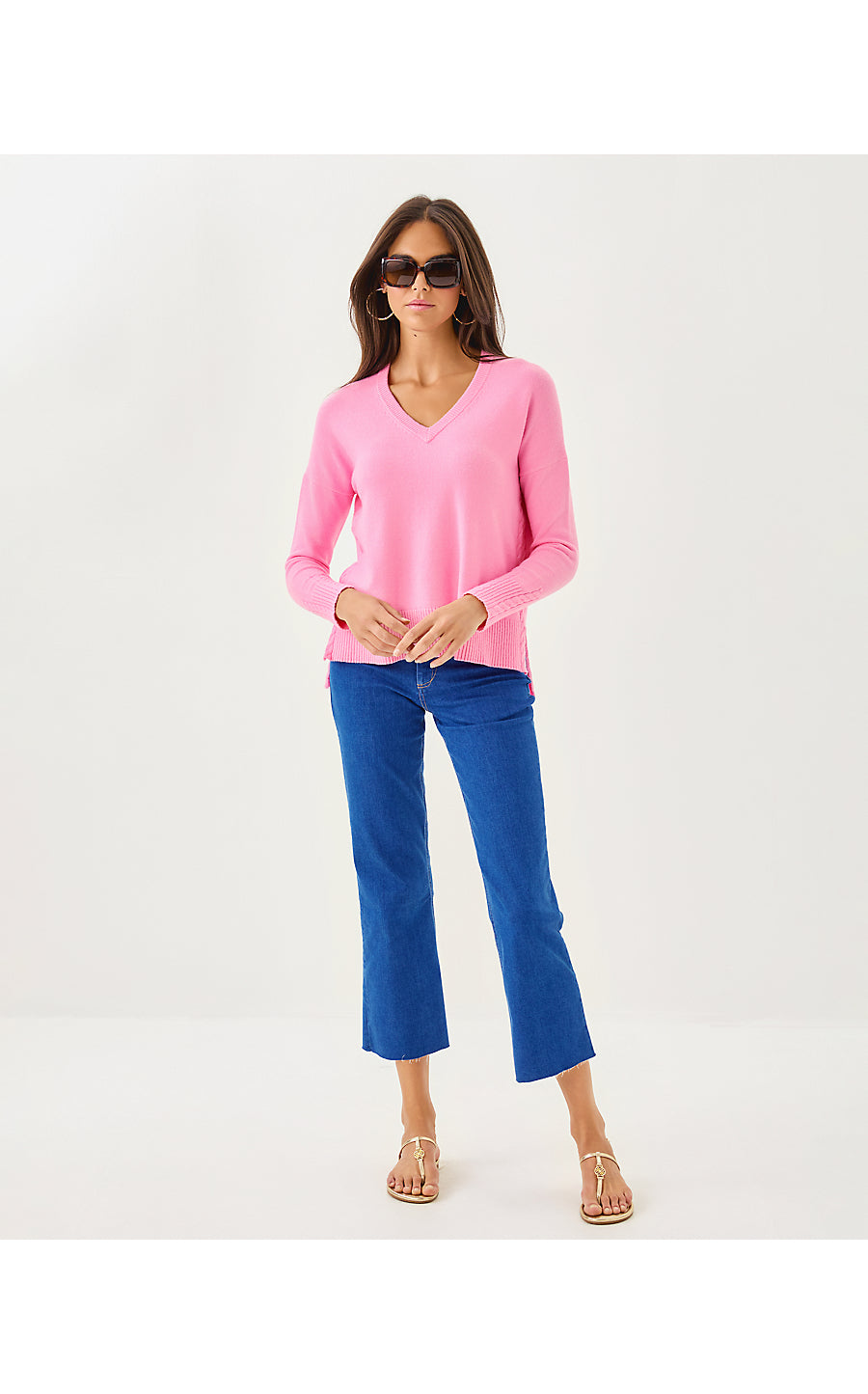 - Relaxed fit, drop shoulder, v-neck sweater with a high-low hem and cable stitch details at the side seams and sleeves.